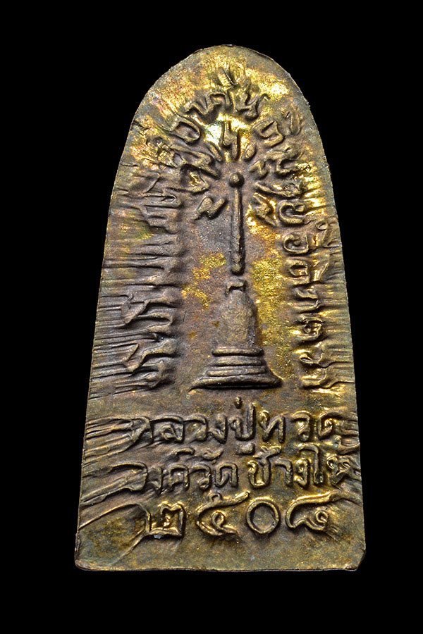 หลวงปู่ทวดวัดช้างให้ เนื้อทองแดงกะไหล่ทอง "ซุ้มกอจิ๋ว" หลังยันต์