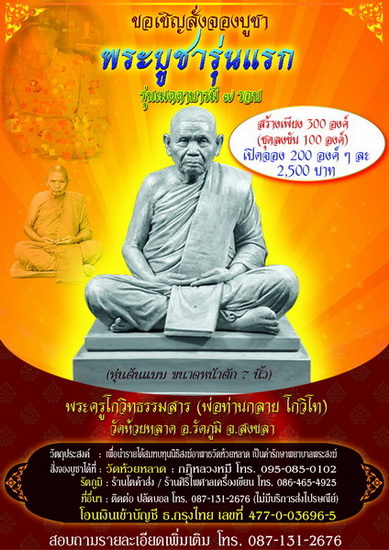 [ รายละเอียด ] ขอเชิญบูชาสั่งจองวัตถุมงคลพระครูโกวิทธรรมสาร หรือพ่อท่านกลาย โกวิโท วัดห้วยหลาด อ.รัตภูมิ จ.สงขลา ในโอกาสเจริญอายุวัฒนมงคล 84 ปี พ.ศ. 2560 รุ่น “เมตตาบารมี 7 รอบ” เพื่อนำรายได้ทั้งหมดสมทบทุนนิธิสงฆ์อาพาธวัดห้วยหลาด ใช้เป็นค่ารักษาพยาบาลพระสงฆ์ ประกอบด้วย 1. ชุดลงขัน จัดสร้างตามจอง ไม่เกิน 100 ชุด ๆ ละ 12,000 บาท รับพระบูชารุ่นแรก 7 นิ้ว พระชัยวัฒน์รุ่นแรกหล่อนำฤกษ์เนื้อเงิน รูปหล่อรุ่นแรกก้นหุ้มทองคำ เงิน นวะโลหะ อย่างละ 1 องค์ และรูปหล่อรุ่นแรกก้นเรียบ 10 องค์ รวมรับ 15 องค์ 2. พระบูชา รุ่นแรก 7 นิ้ว สร้าง 200 องค์ ๆ ละ 2,500 บาท 3. รูปหล่อรุ่นแรกก้นหุ้มเงิน สร้าง 100 องค์ ๆ ละ 1,200 บาท 4. รูปหล่อรุ่นแรกก้นหุ้มนวะโลหะ สร้าง 300 องค์ ๆ ละ 500 บาท 5. รูปหล่อรุ่นแรกก้นเรียบ สร้าง 2,000 องค์ ๆ ละ 200 บาท มีโค้ดและหมายเลขทุกองค์ โทร. 087-131-2676