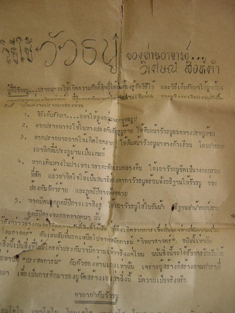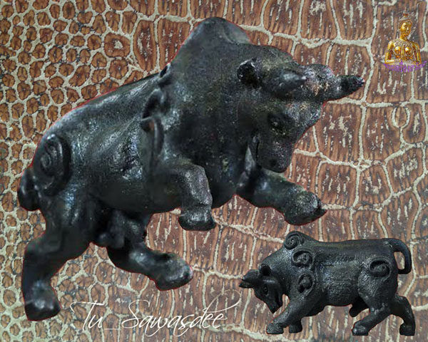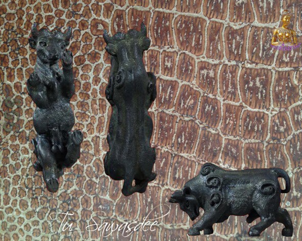 .- อุปเทห์การใช้ ให้หันหน้าวัวออกนอกบ้านป้องกันคุณไสยต่างๆ , หันหน้าวัวเข้าบ้านเรียกทรัพย์สินต่างๆ, ออกค้างแรมในป่า/ ต่างถิ่น ให้นำวัวธนูนี้ ขีดพื้นดินหรือวาด ในอากาศล้อมรอบที่เราพัก จะป้องกันคุณไสย/ ภูตผี สิ่งที่มองไม่เห็นได้, หากมีคนถูกผีเข้าให้ใช้วัวธนู แช่ทำน้ำมนต์รด ดื่มกิน ฯลฯ ทั้งมีข้อความที่ท่านเขียนไว้ว่า "วัวนี้เป็นวัวที่เสกป่าช้า มีค่ายิ่งกว่าวัวธนูเงิน ผู้ใดทำสูญ ผู้นั้นพึงมิใช่คน เรารักยิ่งเสมือนบรมครู" วัวธนูที่ท่านสร้างมีเพียงรุ่นเดียวเมื่อปี ๒๕๑๙ มีอยู่สองเนื้อ วัวธนูเนื้อเงิน จำนวนการมีสร้าง ๙๙ ตัว วัวส่วนหนึ่งแจกให้กรรมการผู้สร้างจำนวน ๑๔ คน และวัวธนูเนื้อโลหะผสม จำนวนการสร้าง ๒,๙๙๙ ตัว เปิดให้คนได้บูชาตัวละ ๓๙๐ บาท ซึ่งในยุคสมัยนั้นนับว่าเป็นราคาที่สูงมาก ขณะที่ราคาทองคำบาทละ ๔๐๐ บาท.... สุดยอดทั้งพิธีกรรม และเจตนาการสร้างเพื่อให้ลูกศิษย์/ คนที่ศรัทธานำมาคุ้มครองตัว | [ ราคา ] ฿9 [ สถานะ ] โชว์พระ