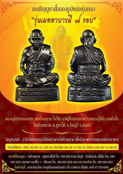 | | [ ชื่อพระ ] รูปหล่อรุ่นแรก พ่อท่านกลาย วัดห้วยหลาด "รุ่นเมตตาบารมี 7 รอบ" | | [ รายละเอียด ] รูปหล่อรุ่นแรก พ่อท่านกลาย วัดห้วยหลาด "รุ่นเมตตาบารมี 7 รอบ" จัดสร้างในโอกาสที่ท่านพระครูโกวิทธรรมสาร หรือพ่อท่านกลาย โกวิโท เจริญอายุวัฒนมงคล 7 รอบ 84 ปี ใน พ.ศ. 2560 ท่านได้มีดำริที่จะจัดหาทุนทรัพย์สมทบทุนนิธิสงฆ์อาพาธวัดห้วยหลาด ซึ่งท่านได้ก่อตั้งขึ้นและเป็นประธานอุปถัมภ์ สำหรับเป็นค่าใช้จ่ายรักษาพยาบาลพระสงฆ์วัดห้วยหลาดในยามอาพาธ จึงได้มอบหมายให้คณะลูกศิษย์ ดำเนินการจัดสร้างวัตถุมงคล รุ่นเมตตาบารมี 7 รอบ ขึ้นเพื่อมอบเป็นที่ระลึกแก่ผู้มีจิตศรัทธาในโอกาสดังกล่าว โดยท่านเป็นประธานที่ปรึกษาการดำเนินการจัดสร้างด้วยตนเอง ผ่านการรวบรวมชนวนมวลสารสิ่งศักดิ์สิทธิ์ต่าง ๆ จากวัด สถานที่ศักดิ์สิทธิ์ และเกจิชื่อดังเป็นแรมปี และการเฟ้นหาสุดยอดนายช่างฝีมือระดับแนวหน้าของประเทศ เพื่อรังสรรค์ผลงานให้มีความวิจิตรบรรจง สมเกียรติแด่ครูบาอาจารย์ ใส่ใจในรายละเอียดทุกขั้นตอน และมีแนวทางการจัดสร้างที่ไม่เหมือนใครโดยใช้วิธีการเชิญชวนผู้มีจิตศรัทธามาร่วมกันลงขันจัดสร้าง เพื่อเป็นการหลอมรวมจิตใจ บนพื้นฐานและปณิธานของคณะลูกศิษย์ผู้ได้รับมอบหมายที่ว่า ต้องทำอย่างชัดเจน โปร่งใส ใจบริสุทธิ์ เพื่อให้วัตถุมงคลรุ่นเมตตาบารมี 7 รอบ เป็นสุดยอดแห่งตำนานวัตถุมงคลที่ทรงคุณค่าสืบไป. จำนวนการจัดสร้าง ประกอบด้วย 1. ก้นหุ้มทองคำแท้ จำนวน 100 (มีเฉพาะในชุดลงขันเท่านั้น) 2. ก้นหุ้มเงิน จำนวน 200 องค์ (อยู่ในชุดลงขัน 100 องค์) เปิดให้บูชา 100 องค์ ๆ ละ 1,200 บาท 3. ก้นหุ้มนวะโลหะ จำนวน 400 องค์ (อยู่ในชุดลงขัน 100 องค์) เปิดให้บูชา 300 องค์ ๆ ละ 500 บาท 4. ก้นเรียบ จำนวน 3,000 องค์ (อยู่ในชุดลงขัน 1,000 องค์) เปิดให้บูชา 2,000 องค์ ๆ ละ 1,200 บาท ตั้งแต่บัดนี้ ถึง 31 ธันวาคม 2559 โทร. 084-055-5405 | [ ราคา ] ฿999999 [ สถานะ ] โชว์พระ