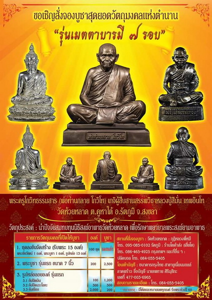 [ รายละเอียด ] ขอเชิญบูชาสั่งจองวัตถุมงคลพระครูโกวิทธรรมสาร หรือพ่อท่านกลาย โกวิโท วัดห้วยหลาด อ.รัตภูมิ จ.สงขลา ในโอกาสเจริญอายุวัฒนมงคล 84 ปี พ.ศ. 2560 รุ่น “เมตตาบารมี 7 รอบ” เพื่อนำรายได้ทั้งหมดสมทบทุนนิธิสงฆ์อาพาธวัดห้วยหลาด ใช้เป็นค่ารักษาพยาบาลพระสงฆ์ ประกอบด้วย 1. ชุดลงขัน จัดสร้างตามจอง ไม่เกิน 100 ชุด ๆ ละ 12,000 บาท รับพระบูชารุ่นแรก 7 นิ้ว พระชัยวัฒน์รุ่นแรกหล่อนำฤกษ์เนื้อเงิน รูปหล่อรุ่นแรกก้นหุ้มทองคำ เงิน นวะโลหะ อย่างละ 1 องค์ และรูปหล่อรุ่นแรกก้นเรียบ 10 องค์ รวมรับ 15 องค์ 2. พระบูชา รุ่นแรก 7 นิ้ว สร้าง 200 องค์ ๆ ละ 2,500 บาท 3. รูปหล่อรุ่นแรกก้นหุ้มเงิน สร้าง 100 องค์ ๆ ละ 1,200 บาท 4. รูปหล่อรุ่นแรกก้นหุ้มนวะโลหะ สร้าง 300 องค์ ๆ ละ 500 บาท 5. รูปหล่อรุ่นแรกก้นเรียบ สร้าง 2,000 องค์ ๆ ละ 200 บาท มีโค้ดและหมายเลขทุกองค์ โทร. 084-055-5405