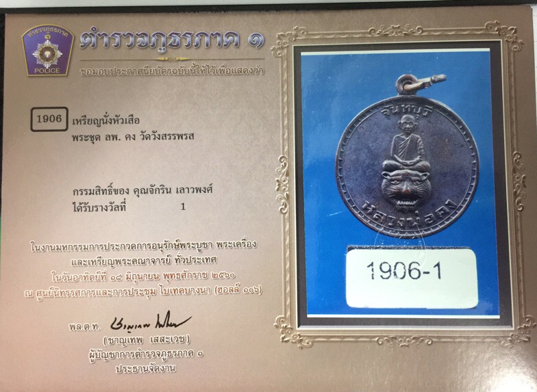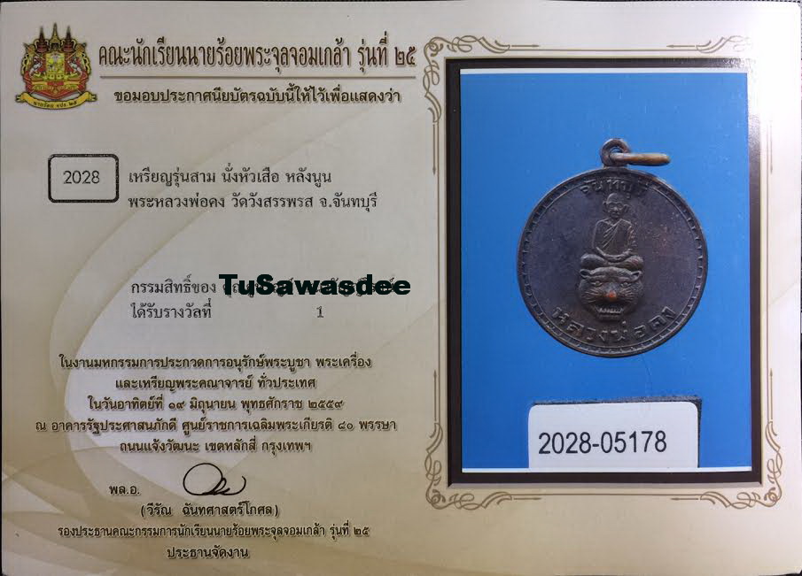 | | [ ชื่อพระ ] เหรียญกลมนั่งหัวเสือ หลังนูน เนื้อทองแดง ปี 2510 | | [ รายละเอียด ] เหรียญกลมนั่งหัวเสือ หลังนูน เนื้อทองแดง ปี 2510 หลวงพ่อคง วัดวังสรรพรส จำนวนการสร้าง 1,000 เหรียญ ปั้มจากเหรียญเนื้อสตางค์แดงในหลุมลูกนิมิตพระอุโบสสถเก่า สุดยอดความหายาก และประสบการณ์มากมายครับ สวย(แชมป์ที่ ๑ งานไบเทคบางนา ๑๘/๐๖/๖๐ จัดโดย กองบัญชาการตำรวจภูธรภาค 1, แชมป์รางวัลที่1 ศูนย์ราชการแจ้งวัฒนะ วันอาทิตย์ที่ 19 มิถุนายน 2559 จัดโดยคณะนักเรียนนายร้อยพระจุลจอมเกล้า รุ่นที่25) เหตุที่ทำให้หลวงพ่อคงดังทะลุฟ้าเป็นที่รู้จักในสมัยนั้น ด้วยเหตุการณ์ที่เกิดขึ้น เป็นลูกศิษย์หลวงพ่อคง วัดวังสรรพรส ถูกถล่มด้วยอาวุธสงครามนานาชนิด และเรื่องนี้เกิดขึ้นในตลาด จึงทำให้คนรู้เห็นมากมาย เรียกว่าทำให้หลวงพ่อคงดังในข้ามคืน วัตถุมงคลของท่านพ่อคง วัดวังสรรพรส สามชิ้นที่ทำให้ นายชำนาญ ผดุงศาสน์ (เสี่ยกี๋) และพรรคพวก รอดพ้นจากคมกระสุนอาก้า/ ระเบิด อาร์ พี จี คือ 1.รูปหล่อบ่าร้าว 2.ตระกรุดชุดของหลวงพ่อคง 3.เหรียญกลมนั่งหัวเสือหลังนูน ดังในรูปที่ลง .................................... ประสบการณ์สร้างชื่อ เสี่ยกี๋ แห่งเหมืองพลอย บ่อเวฬุ อำเภอขลุง จังหวัดจันทบุรี แถบนั้นถามชื่อเสี่ยกี๋ ใครก็รู้จักเป็นอย่างดี มีชื่อในการทำเหมืองพลอยมานาน ชื่อจริง นายชำนาญ ผดุงศาสน์ เป็นศิษย์ ของท่านพ่อคง วัดวังสรรพรส วันนั้นในตัวมีตระกรุดชุดของหลวงพ่อคง ส่วนพรรคพวกอีกสองคนๆ หนึ่งแขวนเหรียญ กลม นั่งหัวเสือหลังนูน อีกคนหนึ่งแขวนรูปหล่อบ่าร้าว ซึ่งพวกเขามั่นใจและบูชายึดมั่นแต่ท่านพ่อ เพราะมีประสบการณ์ ผ่านมามากมาย นับไม่ถ้วน ลูกผู้ชายชื่อเสี่ยกี๋ ทำงานฝ่าดงอันตราย จากการทำงานเหมืองพลอย บ่ายวันหนึ่ง ในเดือนมีนาคมปี พ.ศ.2528 เสี่ยกี๋และพรรคพวก อีกสองคน นั่งกินก๋วยเตี๋ยวอยู่ในตลาดบ่อเวฬุ หลังจากกินเสร็จ แล้วก็ พากันเดิมข้ามถนน มายังรถซึ่งจอดอยู่อีกฝั่งถนน ยังไม่ทันได้เปิดประตูรถ ... เสียงดังเหมือนฟ้าผ่า ก็กัมปนาทขึ้น ปืนอากร้า ดังสนั่นหวั่นไหว ก้องตลาดบ่อเวฬุ ชาวบ้านแตกตื่น หาที่หลบภัยกันจ้าละหวั่น คณะของเสี่ยกี๋ เป็นเป้ากระสุนกลางถนน โล่งแจ้ง ยากที่จะพลาดจากกระสุน ที่ลั่นราวห่าฝนได้ คนทั้งสามคน โดนกระสุนอาร์ก้าเต็มที่ คนละนับสิบนัด เพราะเสียงปืนที่คำรามนั้นดังติดต่อกันนานราว10นาที กระบอกนี้ หมดกระบอกใหม่แทนที่ ติดต่อกัน หลับตานึกถึงเป้ากระสุนกลางถนนดู ไม่เละเป็นบะช่อก็เต็มที่แล้ว เสี่ยกี๋ โดนกระหน่ำ ล้มคว่ำล้มหงาย แล้วลุกขึ้นมาอีกล้มลงไปอีกมือกุมอยู่ที่ด้ามปืน ชักขึ้นมาไม่ทั