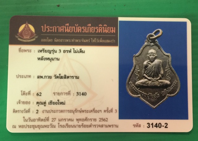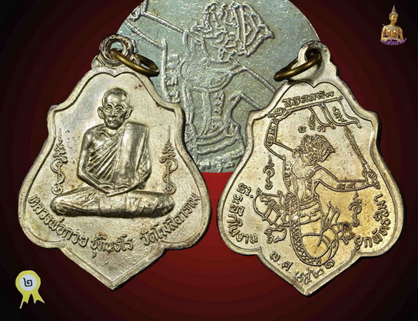 [ รายละเอียด ] รองเชมป์ที่ ๒ งานโรงเรียนนายร้อยตำรวจ สามพราน จัดโดย นิตยสารพระท่าพระจันทร์ ๒๗/๑/๖๒ เหรียญหลวงพ่อกวย วัดโฆสิตาราม รุ่น 3 หลังหนุมานเชิญธง ปี 21 เนื้ออัลปาก้า งามๆ แบบนี้หายากครับ