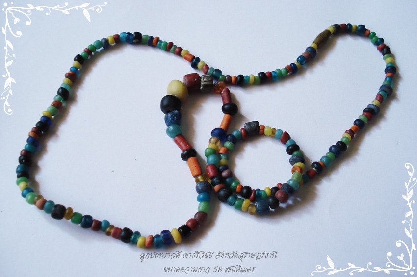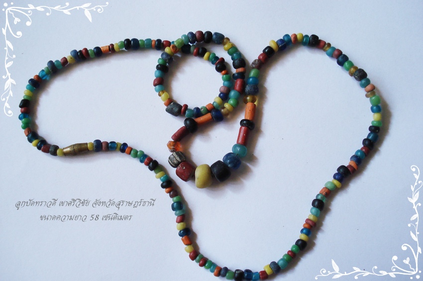| [ รายละเอียด ] สร้อยลูกปัดทราวดี เขาศรีวิชัย สุราษฎร์ธานี อายุประมาณ1500ปี ในอาณาจักรศรีวิชัย ดินแดนแหห่งประวัติศาตร์และอารยธรรมที่เจริญรุ่งเรืองในอดีต ลูกปัดในเส้นทุกเม็ดเป็นลูกปัดที่ขุดค้นพบในเขตบริเวณรอบเขาที่มีพระนารายณ์ ซึ่งเป็นแหล่งเดียวกับการพบพระพิมพ์เม็ดกระดุมศรีวิชัย คัดรงบรวมเอาลูกปัดสีสันต่างไว้ใน้เส้น สำหรับลูกปัดศรีวิชัยหากยิ่งใส่บูชาติดตัวไปนานเท่าไหร่เมื่อสัมผัสเหงื่อลูกปัดจะมีสีสันสดใสขึ้นเรื่อย หากใครมองหาเครื่องประดับที่มีพุทธคุณไปในตัวลองเลือกลูกปัดเขาศรีวิชัยสวมใส่ดูสิครับ รับรองไม่ผิดหวัง