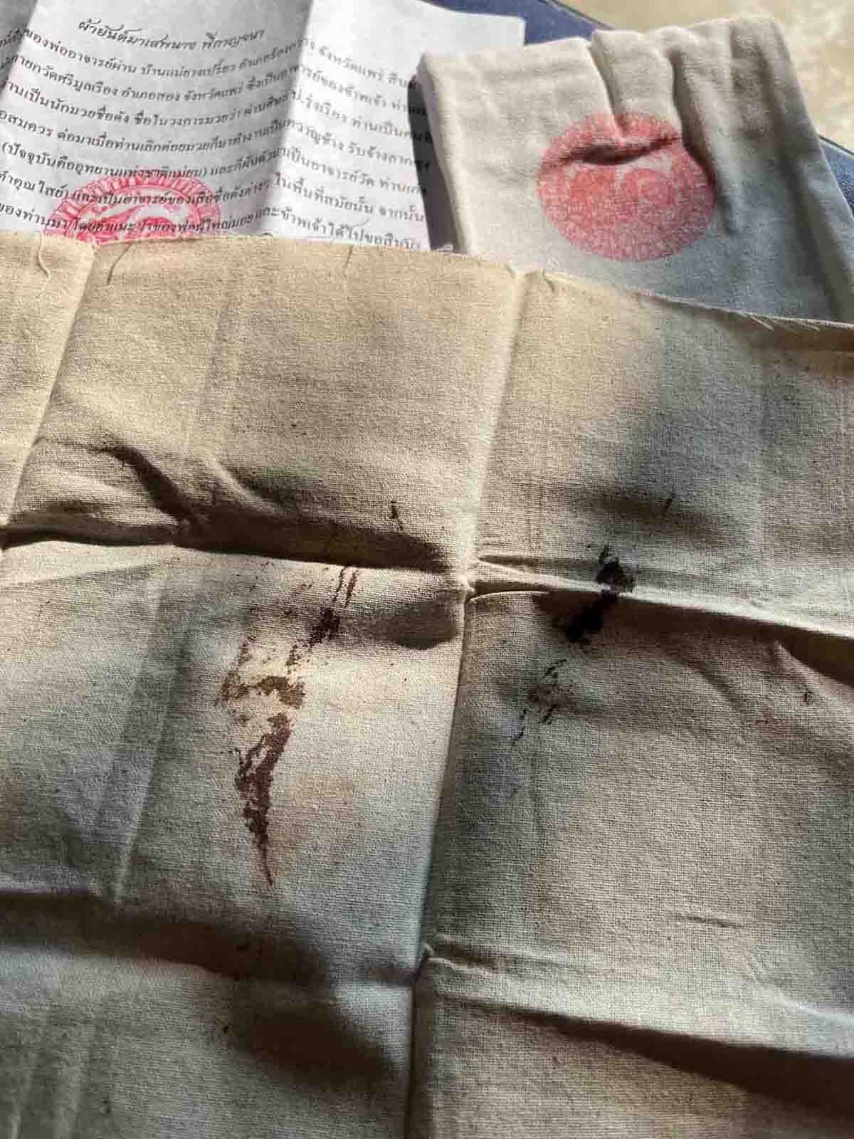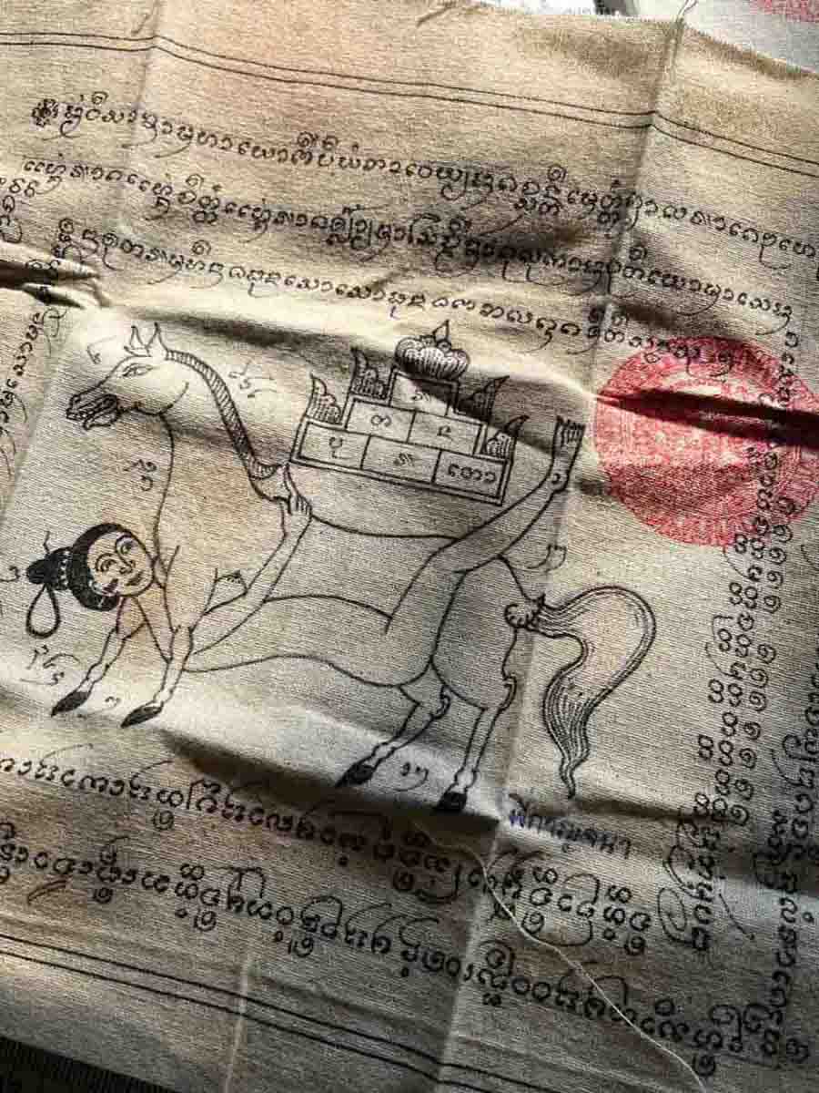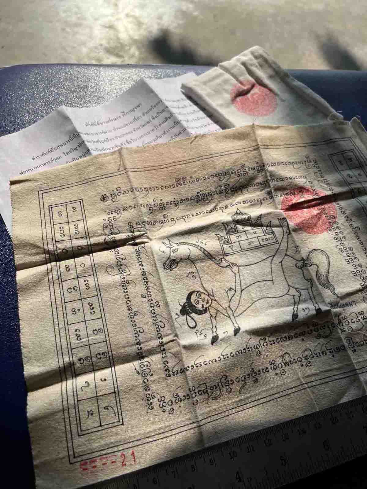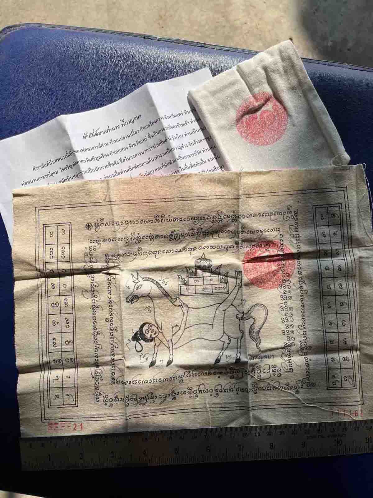 | | [ ชื่อพระ ] ผ้ายันต์อิ่นม้า(ม้าเสพนาง) พี่กาญจนา พระอาจารย์ ธีรภโวภิกขุ หอสิปปกุณเวียงสรอง จัดสร้าง | | [ รายละเอียด ] ผ้ายันต์อิ่นม้า(ม้าเสพนาง) พี่กาญจนา (อุบัติเหตุรถชน ตอนอายุ 30 กว่า) No.๒๑ (ถ้ารู้จักแล้วจะรัก ๑ ใน ๕ ผืน ที่พิเศษ 1, 9, 21, 28, 32) เขียนมือโดย พระอาจารย์ ธีรภโวภิกขุ หอสิปปกุณเวียงสรอง วาระจัดสร้าง ปี ๒๕๖๒ เป็นงานเขียนมือ จำนวน ๓๒ ผืน สร้างจากผ้าอาถรรพน์ ผืนนี้พิเศษมีคราบติดอยู่ให้เห็น.. คาถาบูชาว่า "จิตตะ จิตตั๋ง จิตปั๋ง มะมะ" ว่า ๗ จบ ... อธิษฐานบอกกล่าวตามปราถนา โดยหากต้องการสิ่งใด ให้บอกกล่าวเจ้าของผ้าเอ่ยชื่อในผ้า(พี่กาญจนา) หากสมหวังสมปรารถนาแล้วควรไปทำบุญอุทิศให้เจ้าของผ้า จะเป็นกุศลแก้เจ้าของผ้าและผู้เป็นเจ้าของผ้ายันต์นี้เป็นอันมาก หากว่าสัญญากันไว้กับผ้ายันต์เราก็ควรเลี้ยงตามที่เราสัญญากันไว้ วิธีใช้ ให้เอาหญ้าแพรกอ่อน ๆ ๗ เส้น วางบนม้า และใช้แป้งหรือน้ำอบน้ำหอม ประพรมที่ตัวนาง ยกมือไหว้และระลึกถึงครูบาอาจารย์เจ้าตำรับม้าเสพนางโบราณและบรมครู พ่อปู่ครูดั้งเดิมเจ้าของวิชา ตอนนี้ลูกจะ