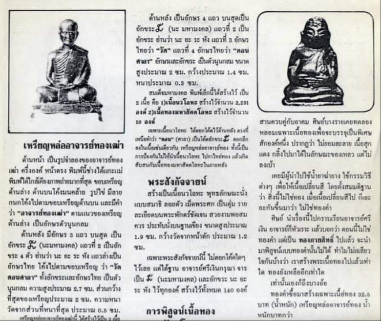 [ รายละเอียด ] พระสมเด็จนะมหามงคล เนื้อทองมหาสัตตะโลหะ พิมพ์เล็ก ปี2525จำนวนสร้าง15องค์ แบบปกติพิมพ์เล็กจะไม่มีการตอกโค๊ตสร้าง10องค์ จารก้นพิเศษ5องค์ เนื้อทองมหาสัตตโลหะ (ทองกายสิทธิ์) เป็นเนื้อทองที่แข็งแกร่งและต้องมีว่านตามตำราเป็นตัวประสานควรคู่กับอาคม เคยมีศิษย์บางคนทดลองหลอมเฉพาะเนื้อทองเพื่อจะบรรจุเป็นพิเศษสักองค์หนึ่ง ปรากฏว่า ไม่ยอมละลาย เนื้อสุกแดงกลิ้งไปมาได้ในลักษณะของเหลวแต่ไม่ลงเบ้า ท่านพระอาจารย์ศรีเงิน อาภาธโร วัดดอนศาลา จ.พัทลุง ได้เปิดเผยแก่คณะศิษย์ที่ตั้งใจช่วยกันสร้างเมรุว่า วิชาสร้างเนื้อทองคำให้เป็นเนื้อกายสิทธิ์ ที่เรียกว่า เนื้อ “ ทองมหาสัตตโลหะ ” ของสำนักเขาอ้อ จากเนื้อทองหนัก 1 บาท จะเพิ่มเนื้อได้เป็น 10 บาท ซึ่งในการสร้างครั้งนี้ท่านเองก็ไม่คาดว่าจะสร้างได้สำเร็จ เพราะในบันทึกได้บอกใบ้เป็นปริศนาคล้ายลายแทงไม่ได้บอกไว้ตรง ๆ ผู้มีปัญญาเท่านั้นที่จะตีปริศนาได้สำเร็จ ในตำราบอกรายละเอียด น้ำหนักโลหะแต่ละชนิด สูตรยันต์ควบคุมโลหะแต่ละอย่างไว้อย่างละเอียด ในการสร้างแต่ละคราวไม่ใช่ทำได้ง่ายๆ เพราะไม่ใช่ผสมโลหะให้รวมตัวกันตามหลักวิทยาศาสตร์เท่านั้น แต่เป็นการสร้างเนื้อให้มีอานุภาพความศักดิ์สิทธิ์ในตัวเองด้วย “ ธาตุกายสิทธิ์ ” ในการสร้างเนื้อทองมหาสัตตโลหะ ในตำราบ่งบอกไว้ว่า เป็นวิชาเล่นแร่แปรธาตุชั้นสูงสุดของสำนักเขาอ้อ ยังไม่เคยมีการทดลองในศิษย์ชั้นหลัง ท้ายตำราเขียนไว้ว่า “ เราเคยทำแล้ว ทำได้ ใครไม่เชื่อ ให้ตกนรกอเวจี เกิดชาติใดอย่าได้พบพระ ” ไม่ใช่เพราะอะไรทุกอย่างขัดกับหลักวิทยาศาสตร์ เป็นของเชื่อยากในปัจจุบัน ใครเห็นตำราแล้วจะดูแคลนว่าเป็นเรื่องเหลวไหลไร้สาระ หลอกลวง อาจารย์ผู้คิดตำรานี้จึงสาปแช่งเอาไว้เป็นการท้าทาย ให้พิสูจน์ แต่ไหนแต่ไรมาตำราของสำนักเขาอ้อไม่เคยผิดพลาด พระอาจารย์ศรีเงินมอบตำราสร้างเนื้อทองมหาสัตตโลหะ ให้ศิษย์ไปศึกษา ก็เจอปัญหาแบบลายแทงเข้าอีก ศึกษาไม่นานก็เข้าใจ เมื่อท่านอาจารย์เข้าใจว่าศิษย์เข้าใจดีแล้ว พระอาจารย์ก็รับภาระที่จะควบคุมพิธีเองในครั้งนี้ เพราะศิษย์เองก็เกรงจะผิดพลาด เพราะเป็นงานใหญ่และละเอียดมาก พระอาจารย์ศรีเงิน เห็นใจศิษย์คณะนี้ที่ตั้งใจสูงมากที่จะช่วยพัฒนาวัด พระอาจารย์ศรีเงินกับศิษย์ขึ้นไปยอดเขาอ้อกลางดึกสงัด เพื่อหาตัวยาชนิดหนึ่งมาเป็นส่วนผสมเนื้อ คือ “ รากเหล็กส่องแสงยามราตรี ” (รากหิ่งหาย) หาพบในคืนที่ 3 “ ทองบ้านงอกได้ ” (ขมิ้น) ก็เป็นอีกอย่างหนึ่งที่เป็นตัวยาผสมเนื้อ 2 อย่าง ในห
