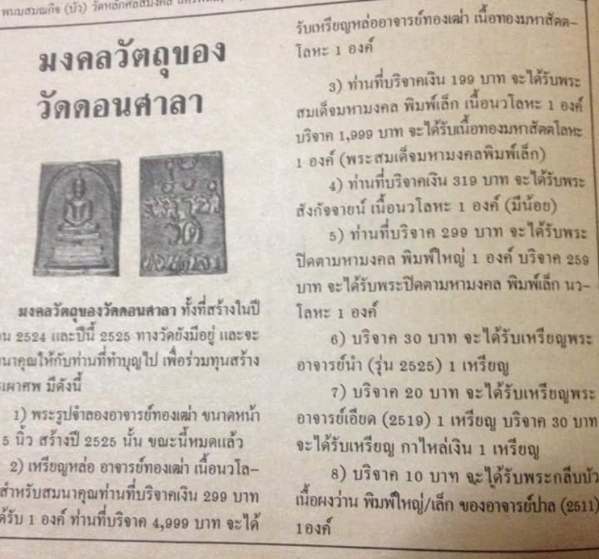 [ รายละเอียด ] พระสมเด็จนะมหามงคล(พิมพ์เล็ก)อ.ศรีเงิน วัดดอนศาลา จ.พัทลุง พระพิเศษพระหล่อนำฤกษ์ไม่ตอกโค๊ต หล่อช่อเป็นต้นไม้5-9องค์ฯ เป็นพระตัดจากช่อ*องค์ที่1*(คณะศิษย์ตัดแบ่งจากช่อครับ) พระสมเด็จของ พระอ.ศรีเงิน วัดดอนศาลา จ.พัทลุง เป็นรุ่น2(พิมพ์เล็ก)ปี2525 เนื้อนวะโลหะตำรับเขาอ้อ...นายช่างได้ถอดแบบจากพระสมเด็จมหามงคลพิมพ์ใหญ่ โดยย่อส่วนไห้เล็กลงพอเหมาะกับสุภาพสตรีและเด็ก ด้านหน้าเป็นพระพุทธประทับนั้งบานอาสนะ3ชั้นพิมพ์4เหลี่ยม ซุ้มชิดขอบจรดซุ้ม ถอดแบบจากสมเด็จวัดระฆังพิมพ์ประธานแต่ย่อส่วนลงมา สวยงามมาก ด้านหลังเป็นตัวอักษร4แถว บนสุดเป็นอักระ (นะ มหามงคล)แถวที่2 เป็นอักขระ อ่านว่า นะ อะ ระ หัง แถวที่3 อักษรไทยว่า วัด แถวที่4 อักษรไทยว่า ดอนศาลา อักษรและอักขระ เป็นตัวนูนกลม ขนาดสูงประมาณ2 ซม. กว้างประมาณ1.4 ซม. หนาประมาณ0.3 ซม.พระสมเด็จมหามงคลพิมพ์เล็กนี้ได้สร้างไว้2เนื้อ คือ 1. เนื้อนวะโลหะสูตรเขาอ้อ สร้างไว้จำนวน2231องค์ 2.เนื้อทองมหาสัตตะโลหะ 10องค์ เฉพาะเนื้อนวะโลหะ ได้ตอกโค๊ตไว้ด้านหลัง ตรงที่เหนือคำว่า ดอน(ศาลา)เป็นโค๊ตอักขระ นะมหามงคล ตอกลึกลงในเนื้อเช่นเดียวกับ เหรียญหล่ออ.ทองเฒ่า ทั้งนี้เป็นการป้องกันไม่ไห้เนื้อนำเนื้อนวะโลหะ ไปกะใหล่ทองแล้วเกิดสับสนกับเนื้อทองมหาสัตตะโลหะในภายหลัง*** วัตถุมงคลชุดมหามงคล ปี2525 มีดังนี้ 1.รูปเหมือนลอยองค์อ.ทองเฒ่า วัดเขาอ้อขนาดบูชาหน้าตัก5นิ้ว 2.เหรียญหล่ออ.ทองเฒ่า วัดเขาอ้อ จำนวน997องค์ 3.พระสมเด็จมหามงคลพิมพ์เล็ก 2231องค์ 4.พระสังกัจจาย์ จำนวน140องค์ รุ่นปี2525 จะตอกโค๊ตตัวนะมหามงคลทุกองค์ ยกเว้นพระสังกัจจาย ท่านจะจารก้นไห้ทุกองค์และพระเนื้อพิเศษ เนื้อทองมหาสัตตะโลหะกับเนื้อโลหะจ้าวน้ำเงิน ที่จะตอกโค๊ตคนละตำแหน่งและไม่ตอกเลย เพื่อเป็นการแยกเนื้อหาได้แจ่มชัดไม่เป็นการสับสนกับเนื้อนวะโลหะ****พระชุดปี2525นี้เป็นพระที่ใช้ชนวนแผ่นพระยันต์ 108ดวง และ29นะของอ.ศรีเงินวัดดอนศาลา สูตรเดิมผสมด้วยเหมือนกับชุดปี 2524 ***แต่ในชุดปี2525นี้ อ.ศรีเงินได้นำแผ่นพระยันต์ของอาจารย์ต่างๆทั้วประเทศไทย แผ่นพระยันต์ท่านละ2แผ่นเกจิดังๆทั่วฟ้าเมืองไทย ที่มีชื่อเสียง จากทั่วสารทิศ ใต้ เหนือ กลาง อีสาน ตะวันออก ***เป็นการรวบรวมแผ่นพระยันต์ที่ได้มากที่สุดในบรรดาสร้างวัตถุมงคล ในภาคใต้ตั้งแต่บันทึกการสร้างไม่มีวัตถุมงคลรุ่นใดจะรวบรวมแผ่นพระยันต์ได้มากถึงเพียงนี้เลย นำมาบรรยายได้ไม่หมด ลองอ่านศึกษาดูจากเอกสารในกระทู้ข้างต้นที่หนังสือลานโพธิ์ โดย อ.นิพัต ธรรมรักษ์ ได้บันทึกเอาไว้ในอดีต....##กรณีพระหล่อ