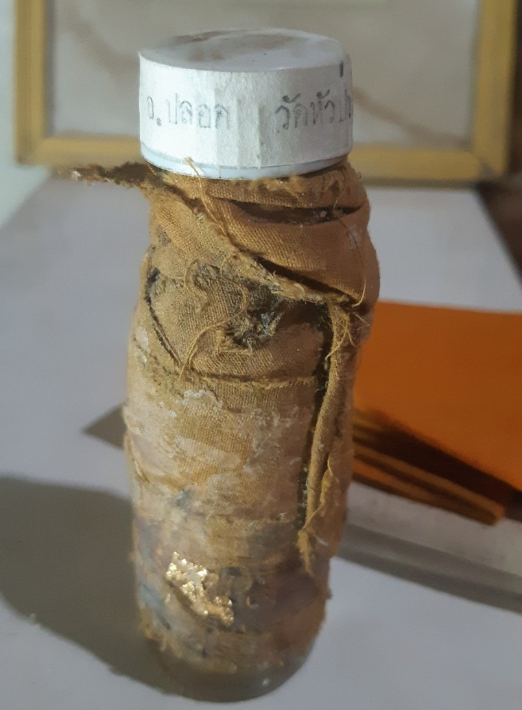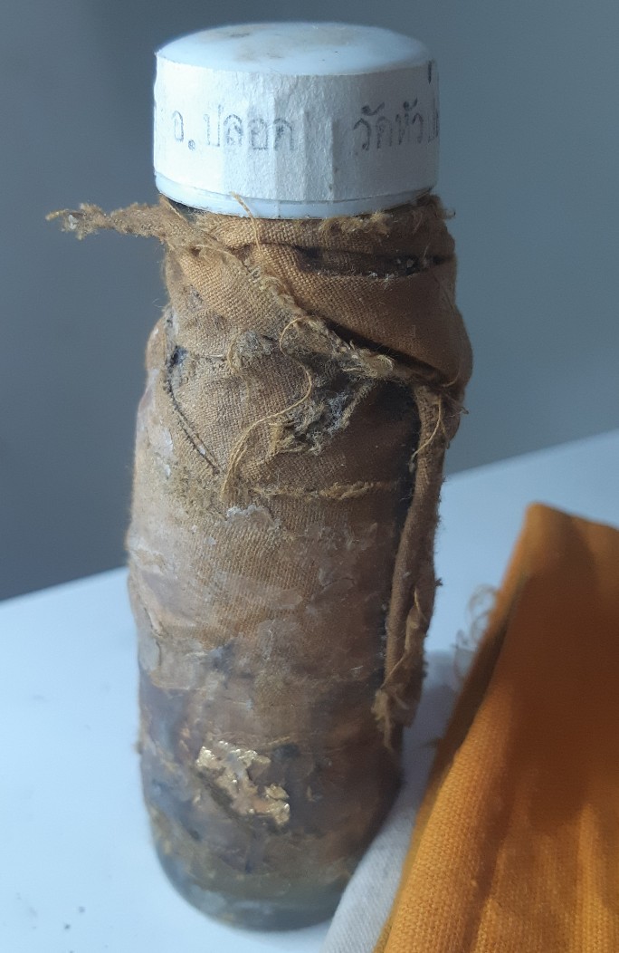 [ รายละเอียด ] สีผึ้งจันทร์เพ็ญ&ทิศมรจันทร์เพ็ญ ของ อ.ปลอด วัดหัวป่า เจ้าของเดิม คือ ตาสอน เพชรคง ซึ่งตาสอนเป็นศิษย์อาจารย์ปลอดเรียนอักระเลขขอมกับตาหลวงปลอดเลย ท่านเป็นคนระโนดโดยกำเนิด มาเป็นเขยฝั่งเลน้อย สีผึ้งขวดนี้ผมได้รับตกทอดมาจากลูกสาวของตาสอน คือ นางสมนึก ชูว่าง อายุ70กว่าปี ที่ผมได้มั่นใจ1ล้าน%ว่าเป็นของตาหลวงปลอด เพราะคุณยายสมนึกได้บอกว่านี้เป็นสีผึ้งจันทร์เพ็ญ ทำในคืนจันทร์เพ็ญ พ่อฉานบอกมาเท่านี้ โร้เท่านี้แหละว่าของตาหลวงปลอด(ผมได้ฟังแล้วขนลุกเลย คนอายุปูนนี้แล้วคงไม่เล่านิทานแน่ครับ เพราะไม่ได้เป็นคนเล่นพระแต่อย่างใด คำที่พูดว่าจันทร์เพ็ญอะ) ***แกยืนยันมาตลอดว่าสีผึ้งยี้ พ่อได้รับมาจากตาหลวงปลอดเลย และจีวรที่ห่อหุ้มบุข้างขวดไว้นั้น เป็นจีวรของ อาจารย์คง วัดหัวป่า ครับบุจีวรไว้กับเทียน คุณตาสอน เพชรคง ถ้าถามคนแก่ๆในระแวกหัวป่านั้นเขาจะรู้จักกัน เพราะแกช่วยหามวลสารว่านยาและมีความคุ้นเคยกับตาหลวงเป็นอย่างมาก ตาสอนบวชกับ อ.คง แต่เรียนอักระกับตาหลวงปลอด และมีความเชี่ยวชาญในอักระเลขยันต์ด้วยและอีกอย่างนึงตาสอน เป็นเพื่อนสนิทกับหมอแจ้ง ซึ้งเป็นหมอในทางไสยศาสตร์(อันนี้ก็ไม่รุ้ว่าแจ้งไหน แต่ผมเดาเลยว่าคงต้องเป็น อ.แจ้ง เพชรรัตน์ แห่งสำนักเขาอ้อแน่) อันนี้ลูกสาวของตาสอนยืนยัน...และที่สำคัญที่ขวดสีผึ้งขวดนี้มีพิมพ์ชื่อสัญลักษณ์ไว้ด้วยกระดาษสาเก่าชัดเจน พิมพ์เก่าด้วยพิมพ์ดีดแต่แรกเลย และข้างในขวดมีเทียนปักอยุ่หนึ่งเล่มคู่กับตะกรุดทิศมรดอกเล็กประมาณ2นิ้ว 1ดอก เนื้อตะกั่วดำ**ผมคลี่เอาไว้ศึกษาผู้เชี่ยวชาญในด้านนี้เป็นตะกรุดจันทร์เพ็ญล้าน%... "น้ำมันขวดนี้ผมครอบครองมาหลายปีมากแล้วครับ"...อันนี้ อยุ่ที่ความเชื่อนะครับ ของแบบนี้หาค่ามิได้มีคุณค่าทางจิตใจสูงมาก...ขออนุญาติโชว์อย่างเดียวครับ