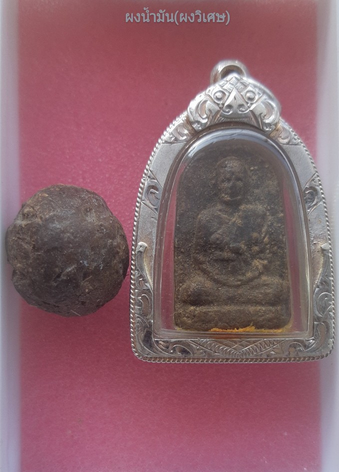 [ รายละเอียด ] ลูกอม"อ.ปลอด วัดหัวป่าผงน้ำมัน หรือผงวิเศษ ที่ใช้มวลสารที่ลบผงวิเศษ5ประการ :ถอดจากคำบันทึกจากท่านปลอด ที่ศิษย์ได้บันทึกไว้ของเนื้อผงมันนี้ กรรมวิธีการสร้างนั้นยุ่งยากมากและต้องใช้เวลาพอสมควร ตาหลวงปลอด ได้กำหนดสูตรลบผงพระยันต์108 ในอุโบสถ ที่วัดหัวป่า นานถึง3เดือน หรือ1ไตรมาส เนื้อผงน้ำมันนั้นกว่าจะได้มาสร้างไม่ใช่เรื่องง่ายๆเลย เป็นการทำขึ้นเป็นกรณีพิเศษ...พระเนื้อผงมันหรือลูกอมตาหลวงได้รวมผงวิเศษไว้ครบถ้วนตามตำราเนื้อหามวลสารค่อนข้างจะละเอียด ผสมผงว่านและน้ำมันตั๋งฮิ้วประสานกัน ไห้เนื้อหาแกร่ง ปกติถ้าเป็นผงน้ำมันในสายอื่น จะออกเป็นสีขาวมใสแกร่ง มัน... แต่ของท่านผงน้ำมันจะออกคล้ำน้ำตาล เพราะมีส่วนผสมกับว่านยา108เพิ่มเติมอีกด้วย.... ลูกอมผงน้ำมันนี้พุทธคุณใช้ได้108ประการ ครอบจักรวาล เม็ดนี้สมบูรณ์และสวยมาก มีเส้นเกศาและเพชรหน้าตั้ง อยุ่ในลูกอมอย่างเห็นได้ชัดครบสูตรแบบนี้เจอได้น้อยและหาได้ยากมากๆครับ