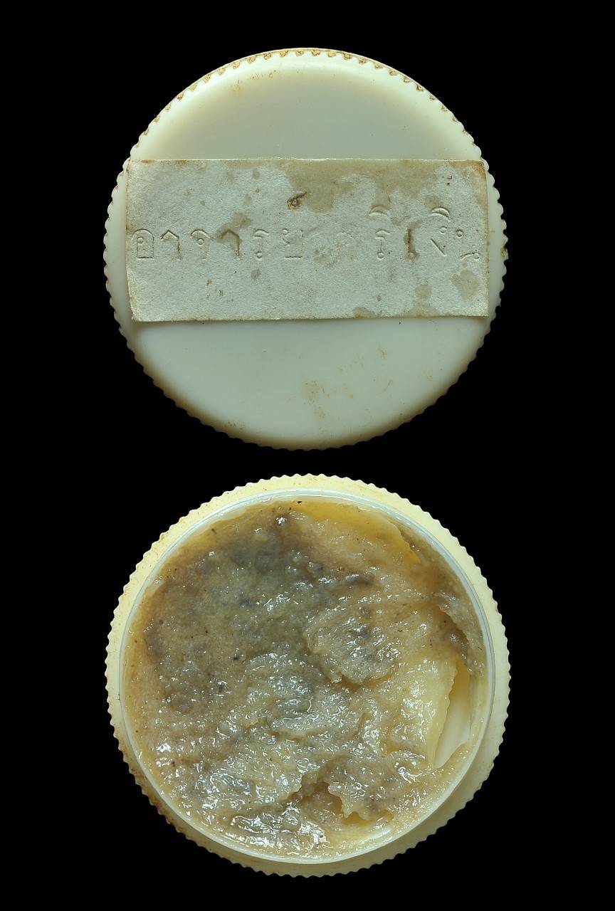 [ รายละเอียด ] สีผึ้งเมตตามหานิยม อ.ศรีเงิน วัดดอนศาลา จ.พัทลุง ใช้ทาปาก คิ้ว และหน้าผาก ไปเจรจาขอร้อง ไปติดต่อธุระกิจ ไปทวงหนี้ ไปหาเจ้านายผู้ใหญ่ ไปในที่ชุมชนเป็นที่เมตตาเอ็นดู ไห้ภาวนา มะทัก อะรัก อุชม นะอะระหัง สีผึ้งเมตตามหานิยมของ อ.ศรีเงินนั้น ท่านได้สร้างตามตำราตำรับเขาอ้อ ที่ท่านได้เรียนมาจาก อ.นำ ตั้งแต่พิธีการหุงสีผึ้ง การผสมมวลสาร การหามวลสาร วิธีการเสกและการบรรจุลงตลับและทำพิธีต่างๆ อ.ศรีเงิน ได้ศึกษาวิชาการทำสีผึ้งนี้ใช้เวลามา10ปีเต็มๆ จากข้อมูลจากคณะศิษย์บอกว่า ครั้นอาจารย์ศรีเงินทำสีผึ้งนั้น ทำครั้งตั้งแต่อ.นำ อ.ปาน ยังมีชีวิตอยุ่ และหามวลสารและวัสดุมวลสารในการสร้างอยุ่นานหลายปีกว่าจะครบ และวิธีการสารไม่ใช่เรื่องง่ายเลยครับ สีผึ้งนั้นทำพิธีหุงกันในพระอุโบสถวัดดอนศาลา พิธียุ่งยากมากๆในแต่ละครั้ง ขี้ผึ้งต้องไห้ได้น้ำหนักตามว่าตำรา และต้องเป็นขี้ผึ้งแท้เท่านั้น มีน้ำมันมงคลต่างๆ ดอกไม้หอมมงคล ว่านยาที่เป็นเสน่ห์ต่างๆและมวลสารอื่นๆอีกมากครับ ขั้นตอนการเสกต้องเสกในขณะที่กำลังกวนสีผึ้งไปด้วย วัสดุที่นำมาใช้หุง ต้องเป็นตามโบราณระบุไว้เท่านั้นครับ ไม้ฟืนที่ใช้ทำเชื้อเพลิงต้องเป็นไม้ตามตำรา หม้อดินเผาที่ใช้สำหรับหุง ต้องลงอักระตามตำราทุกตัว ไม้ที่ใช้ในการกวนสีผึ้งต้องเป็นไม้มงคลและลงอักระเลขยันต์ตามตำรา และอีกหลายๆอย่างที่เกี่ยวกับการสร้างสีผึ้งเมตตามหานิยม การสร้างสีผึ้งมหานิยม ตำรับเขาอ้อนั้น ของ อ.ศรีเงินมีน้อยมากๆหาของจริงหาได้ยากมากครับปัจจุบัน อ.ศรีเงินได้ทำพิธีหุงขึ้นในเมื่อมีพิธีธีปลุกเสกพระของท่าน แต่ละพิธีไม่ได้มีมากครับ สร้างตามตำราฉบับเขาอ้อครับ ตลับนี้เป็นสีผึ้งของวัดดอนศาลา สร้างมาตั้งแต่ยุค อ.นำ อ.ปาน สร้างแต่ละครั้งน้อยมากๆ เพราะพิธีการสร้างแต่ละครายุ่งยากมากๆครับ ยุคปรายๆของ อ.นำ อ.ปาน อ.ศรีเงิน วัดดอนศาลาสร้างขึ้นมาเอง แต่ยุคต้นๆอ.นำ อ.ปาน ยังทันได้เสกอยุ่เช่นเดียวกันกับตะกรุดผ้ายันต์ที่อ.นำ ไห้อ.ศรีเงิน ลงอักระและท่านจะเป็นผู้ปลถกเสก จากนั้นอ.ศรีก็ได้สร้างขึ้นมาจนถึงปี30กว่าๆเนื้อหาและความเก่าของตลับ จะแตกต่างกันเล็กน้อยครับ ตลับเก่าเดิมๆ โชว์ครับ