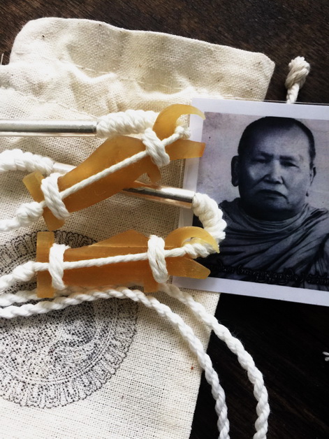 | | [ ชื่อพระ ] งัวธนูพญาอินทร์(ตะกรุดเงิน) ตามตำราของครูบาอินตา วัดวังหงส์ใต้ | | [ รายละเอียด ] งัวธนูพญาอินทร์ (ตะกรุดเงิน) ตามตำราของครูบาอินตา วัดวังหงส์ใต้ จังหวัดแพร่ หรือ(พระครูอนุกูล สาธุกิจ)อดีตเจ้าอาวาส วัดวังหงส์ใต้ สืบมาแต่ครูบาเจ้ามนตรี ธมฺมเมธี (พระครูวิฑิตพิพัฒนาภรณ์) วัดพระธาตุสุโทนมงคลคีรี อ.เด่นชัย จ.แพร่ พี่หนานพุทธิคุณไปขอสืบตำราวัวธนูนี้จากหลวงพ่อครูบาเจ้ามนตรี ตำรากล่าวว่า สิทธิก๋ารพญาอินทาเจ้าฟ้าเอามาสอนหื้ออ้ายก่ำพร้างัวตองว่า อ้ายก่ำพร้ากันมึงไคร่เป๋นใหญ่ ใคร่กิ๋นบ้านกิ๋นเมือง เป๋นที่ปิยะรักหุมแก่คนตังหลายดั่งอั้น หื้อมึงไปเอาเขางัวมาขวักหื้อเป๋นรูปงัว ๒ ตั๋วดูงามองอาจ แล้วจิ่งเอาคาถานี้สลูปใส่ยังเขางัว ๒ ตั๋วปิ๊สยำองอาจนั้นเต๊อะ มึงก็หากจักหันในหั้นจุอันแล แม้นว่าอุปัทวะกั๋งวลอลตรายอันใดอันหนึ่งเกิดขึ้นก็ดี ก็หากจักร่ำงับดับหายไปจะแล แม้นว่าจักไปรบเศิกก็ดีสัพพะว่าอาวุธเครื่องฆ่ามีด หอก ดาบ ปืน ธนู หน้าไม้ หลาว ไม้เหลี้ยม สีหนาถบ่มาใกล้ได้แล แม้นว่าผีกะ ผีพราย ผีป่า ผีห่าตังหลาย และโจ๋รผู้ร้ายก็บ่อาจจักมากระทำร้ายได้แล อันหนึ่งกันว่าไข้เจ็บเกล้าเมาหัวมัวต๋า แลปวดเลือดขึ้นม้านฮุงพิษก็ดี หื้อเอางัวธนูแช่น้ำหื้อกิ๋นหาย อายุหมั้นยืนยาวแต้แล กันว่าจักหื้อมีสัมปัตติข้าวของนองลาภะก็ดี ก็มีมากนักแลแม้นถือไว้กับตั๋วจักบรมวลด้วยข้าวของเงินคำแล ใช้ได้พันช่องค่าหากควรเมืองแต้แล อันนี้พญาอินทร์บอกหื้ออ้ายก่ำพร้าแล แป้ราเก๋นตู้ลองของร้าย ถูกกุณผีกุณคนเอาแช่น้ำรดอาบหายแลเจ้าเหยฯ #วัวธนูพญาอินทร์นี้สร้างมาจากเขากระทิง แกะเป็นรูปวัวจารคาถากำกับที่ตัววัว กำกับด้วยตะกรุด๒ดอกตามตำราตอกโค๊ตกำกับทุกดอก บรรจุอยู่ในถุงผ้าพร้อมกับรูปครูบาอินตา แนบใบฝอยวิธีการใช้ รันเลขนัมเบอร์ที่ถุงผ้า #ท่านสามารถนำไปแขวนไว้บนประตูเข้าบ้าน ในรถ หรือพกติดตัวก็ได้ #ธีรภโวภิกขุ