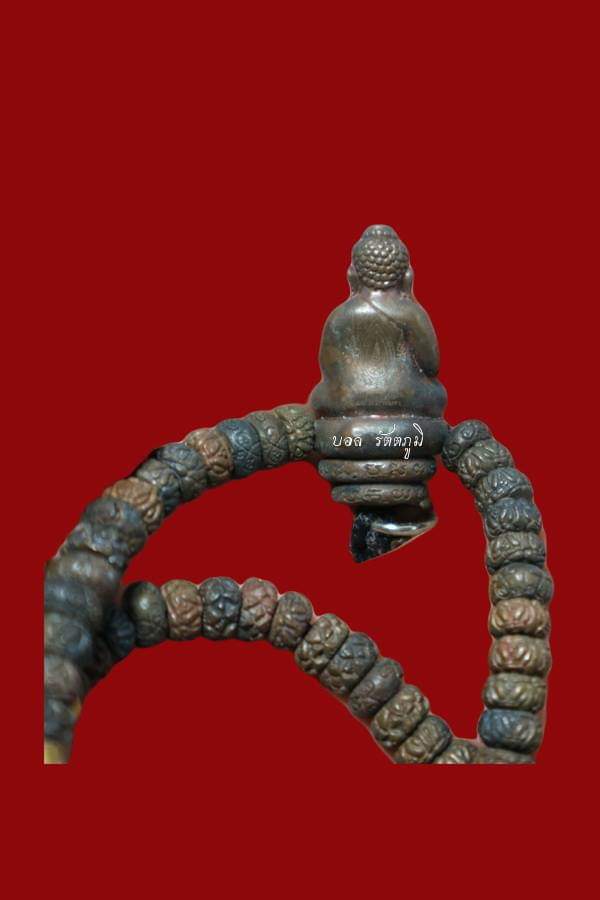 [ รายละเอียด ] สังวาลย์กริ่งโปร่งฟ้าประคำปราบหงษา เนื้อนวะโลหะ, เม็ดประคำมหายันต์ เนื้อนวะโลหะ, ตะกรุดดาวล้อมเดือน ถักเชือกลงรักปิดทองคำแท้ ๕ ดอก รุ่น "ขุมทรัพย์เขี้ยวแก้ว ปี ๕๒" สร้าง ๑,๙๙๙ เส้น
