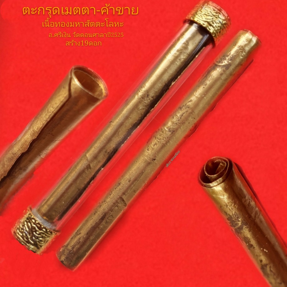 [ รายละเอียด ] ตะกรุดเมตตามหานิยม-ค้าขาย อ.ศรีเงิน วัดดอนศาลา พัทลุง ปี2525 เนื้อทองมหาสัตตะโลหะ สร้าง32ดอก ตะกรุดนี้ไห้ใช้ติดตัวไปในที่ต่างๆ เป็นมหานิยมแล ติดตัวไปค้าขายซื้อง่ายขายคล่องแล ภาวนา รึกรือ ลึกลือ มะอะอุ นะอะระหัง วิชานี้เป็นวิชาที่พระอาจารย์ศรีเงิน ได้เรียนมาจาก พระอาจารย์นำ เป็นตำราของอ.นำ วัดดอนศาลาเพราะพระอาจารย์นำ ก็ได้ลงตะกรุดนี้เช่นกัน อ.ศรีเงินได้เรียนวิชาสืบต่อมาจากท่าน ว่ากันว่า เป็นตะกรุดที่เมตตามหานิยมสุดๆ ได้ทั้งมหานิยม และใช้ในการค้าขาย จะมีผลยิ่งนัก น่าใช้ติดตัวตามที่ตำราได้พรรณนาไว้ และเมื่อปี2525ก็ได้มีการสร้างตะกรุดเนื้อทองมหาสัตตะโลหะนั้นได้นำโลหะตามตำราที่เล่นแร่แปรธาตุมาหลอมแล้วก็ทุบรีดตามตำราไห้เป็นแผ่นและลงอักระประเภทยันต์ที่ต้องการจะทำ***จำนวนการสร้างประเภทตะกรุดเนื้อทองมหาสัตตะโลหะที่บันทึกในรายการวัดที่จัดสร้างมีดังนี้ 1.ตะกรุดเกราะเพชรพระพุทธเจ้า 19 ดอก(พิเศษอุดผงเกราะเพชร5ดอก) 2.ตะกรุดฝนแสนห่าพิชิตมาร 19 ดอก 3.ตะกรุดจตุโรบังเกิดทรัพย์มหาลาภ 32 ดอก 4.ตะกรุดเมตตาค้าขาย 32 ดอก และตะกรุดมหาลาภ แจกให้คนใกล้ชิดอีกจำนวนหนึ่ง ดอกเล็กขนาดประมาณ1.5นิ้ว และพระและเครื่องรางอีกหลายรายการในชุดปี2525-2526 ที่เป็นเนื้อทองมหาสัตตะโลหะ แต่ละประเภทสร้างแค่หลักสิบเท่านั่น...***ทองมหาสัตตะโลหะเมื่อนำมาสร้างเป็นตะกรุดตำราได้ระบุไว้ว่า... จะเป็นใหญ่กว่าตะกรุดทั้งปวง ถ้าทำเป็นพระพระก็จะใหญ่กว่าพระทั้งปวง ทำเป็นประคำจะเป็นธรรมราช เป็นใหญ่กว่าธรรมทั้งปวง สมกับคำโบราณที่กล่าวว่า ตีราคาแสนตำลึงแล เป็นวัตถุมงคลที่หาค่ามิได้ ค่าควรเมืองอย่างยิ่ง ตะกรุดทองมหาสัตตะโลหะของท่าน อ.ศรีเงิน วัดดอนศาลานั้น หายากมากๆ... สมัยนั้นก่อน ทำบุญบริจากวัด ในปี2525 ไห้ทำบุญดอกละ5000บาท สร้างไว้แค่หลักสิบดอกเท่านั้นมี4ประเภทยันต์....ถือว่าราคาสูงมากในชุดทองมหาสัตตะโลหะ พระเหรียญหล่อ อ.ทองเฒ่า เหรียญหล่อ อ.ทองเฒ่า ทำบุญ4999บาท ถ้าทำบุญ1999บาท สมเด็จพิมพ์เล็ก เนื้อทองมหาสัตตะโลหะ พระเครื่องหรือเครื่องรางที่เป็นทองมหาสัตตะโลหะนั้น มีหลายประเภท แต่ประเภทละ หลัก10 เท่านั้น....ทองมหาสัตตะโลหะ 1ในวิชาโลหะศาสตร์ วิชาเล่นแร่แปรธาตุชั้นสูงของสำนักเขาอ้อ ประเภทตะกรุดเนื้อทองมหาสัตตะโลหะที่สร้างมีดังนี้ 1.ตะกรุดเกราะเพชรพระพุทธเจ้า19ดอก(อุดผงเกราะเพชร5ดอก)2.ตะกรุดฝนแสนห่าพิชิตมาร19ดอก(อุดผงพุทธคุณ5ดอก) 3.ตะกรุดจตุโรบังเกิดทรัพย์มหาลาภ32ดอก (อุดผงพุทธคุณ5ดอก) 4.ตะกรุดเมตตาค้าขาย32ดอก 5.ตะกรุดดวงเศรษฐี19ดอก ฯลฯ และพระและเครื่