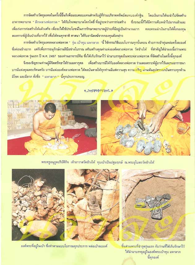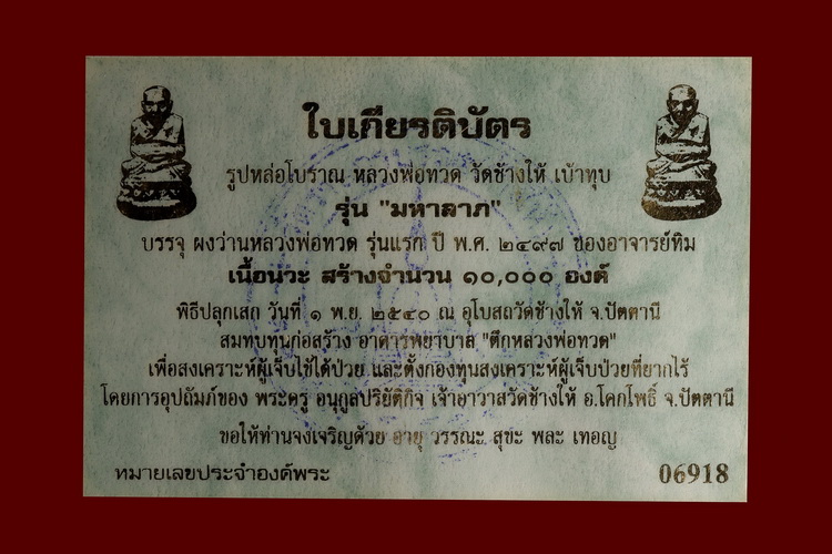[ ÃÒÂÅÐàÍÕ´ ] ž.·Ç´ ÃÙ»ËÅèÍàºéҷغÁËÒÅÒÀ ÃØè¹¡°Ô¹ »Õ 2540 à¹×é͹ÇÐâÅËÐ (2) ËÁÒÂàÅ¢ 6918 Çѵ¶ØÁ§¤ÅËÅǧ¾èÍ·Ç´ “ÃØè¹àºéҷغÁËÒÅÒÀ” ËÃ×ÍàÃÕ¡ÍÕ¡ª×èÍÇèÒ “ÃØè¹¡°Ô¹ »Õ ¾.È. òõôð”´Óà¹Ô¹¡ÒèѴÊÃéÒ§â´Â ·èÒ¹¾ÃФÃÙ͹ءÙÅ»ÃÔÂѵԡԨ ËÃ×;èÍ·èÒ¹ÊÇÑÊ´Ôì ÍÃØâ³ à¨éÒÍÒÇÒÊÇÑ´ªéÒ§ãËé µÓ¹Ò¹¼Ùé¨Ñ´ÊÃéÒ§Çѵ¶ØÁ§¤ÅËÅǧ¾èÍ·Ç´ÂØ¤¡ÅÒ§ ÍѹÅ×ÍÅÑ蹨ӹǹËÅÒÂÃØè¹ ãªé¡ÃÃÁÇÔ¸ÕâºÃÒ³·Ø¡¢Ñ鹵͹ ´éÇ¡ÒÃà¢éÒËØè¹ËÅèͤÃÑé§ÅÐͧ¤ì â´ÂÁÕ¡ÒùӼ§à¹×éÍÇèÒ¹¾ÃÐËÅǧ¾èÍ·Ç´ÃØè¹áá »Õ ¾.È. 2497 ¢Í§¾ÃÐÍÒ¨ÒÃÂì·ÔÁ «Öè§ä´éà¡çºÃÑ¡ÉÒäÇé ¹ÓÁÒºÃèØÅ§ã¹¾ÃÐËÅǧ¾èÍ·Ç´·Ø¡Í§¤ì «Öè§¡ÒèѴÊÃéÒ§Çѵ¶ØÁ§¤Å㹤ÃÑé§¹Õé¢Ö鹡çà¾×èÍÁͺµÍºá·¹ÊÓËÃѺ¼Ùé·ÕèÃèÇÁºÃÔ¨Ò¤·ÃѾÂìÊÁ·ºÍ§¤ì¡°Ô¹ â´Âà§Ô¹ÃÒÂä´é¨Ð¹Ó仨ѴÊÃéÒ§ÍÒ¤ÒþÂÒºÒÅ “µÖ¡ËÅǧ¾èÍ·Ç´” ãËé¡Ñºâç¾ÂÒºÒÅ⤡⾸Ôì ·ÕèÍÂÙèÃÐËÇèÒ§¡ÒáèÍÊÃéÒ§ áÅйÓ仵Ñ駡ͧ·Ø¹Ê§à¤ÃÒÐËì¼Ùéà¨çº»èÇÂÂÒ¡äÃé »ÃСͺ¾Ô¸Õ¾Ø·¸ÒÀÔàÉ¡ àÁ×èÍÇѹ·Õè 1 ¾ÄȨԡÒ¹ ¾.È. 2540 ³ ¾ÃÐÍØâºÊ¶ÇÑ´ªéÒ§ãËé ¨.»ÑµµÒ¹Õ â´Â¾ÃÐÍÒ¨ÒÃÂì¹Í§ ÇÑ´·ÃÒ¢ÒÇ áÅФ³Ò¨ÒÃÂìÊÒÂËÅǧ¾èÍ·Ç´ ¨Ó¹Ç¹¡ÒèѴÊÃéÒ§ »ÃСͺ´éÇ à¹×éͷͧ¤Ó 199 ͧ¤ì à¹×éÍà§Ô¹ 1,999 ͧ¤ì à¹×éÍʵҧ¤ìà¡èÒ (·Í§·Ô¾Âì) 2,999 ͧ¤ìáÅÐà¹×é͹ÇâÅËÐ 9,999 ͧ¤ì áÅÐÁÕãºà¡ÕÂõԺѵáӡѺËÁÒÂàÅ¢»ÃШÓͧ¤ì¾ÃÐ