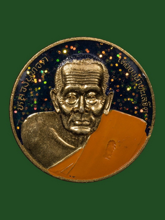เหรียญกลมหลวงพ่อทวด วัดช้างให้ รุ่นรวยไม่เลิก ปี 2538 เจาะห่วง ลงยาน้ำเงิน จีวรเหลือง