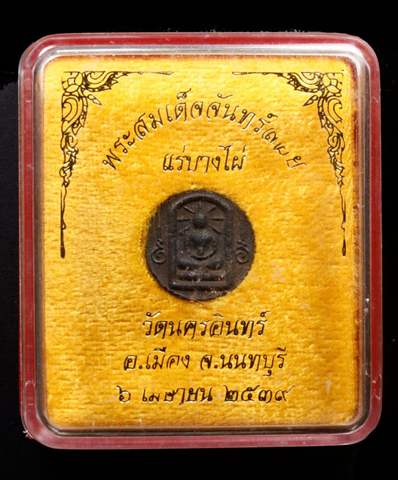 [ รายละเอียด ] พระสมเด็จจันทร์ลอย สร้างด้วยเนื้อแร่บางไผ่ ของวัดนครอินทร์ จ.นนทบุรี ปี2539 พระชุดนี้ได้พระเกจิอาจารย์ที่มีชื่อเสียงหลายท่านร่วมมหาพิธีพุทธาภิเษก อาทิ หลวงพ่อเก๋ วัดแม่น้ำ หลวงพ่อเฮ็น วัดดอนทอง หลวงปู่ทิม วัดพระขาว หลวงพ่อเมี้ยน วัดโพธิ์กบเจา หลวงพ่อสร้อย วัดเลียบ หลวงพ่ออินทร์ วัดบ้านบัว หลวงพ่อผล วัดเชิงหวาย หลวงพ่อทองใบ วัดสายไหม และอีก 9 คณาจารย์ ของวัดนครอินทร์ และวัดชนะสงคราม หลายท่านคงทราบกันดีอยู่แล้วเกี่ยวกับแร่บางไผ่ ของวัดนครอินทร์ เพราะเป็นแร่บางไผ่อันลือลั่นสนั่นทุ่งเกี่ยวกับพระปิดตาแร่บางไผ่ของวัดโมลี สู่ วัดนครอินทร์ องค์นี้พร้อมกล่องเดิมๆ จากวัดครับ สภาพร้อยเปอร์เซ็นท์