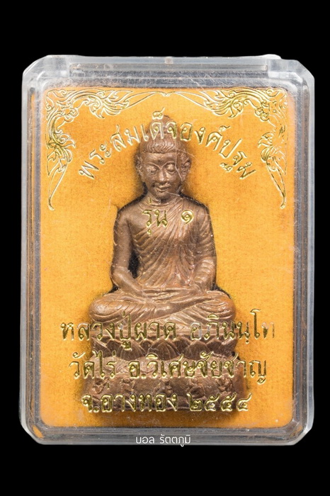 [ รายละเอียด ] พระสมเด็จองค์ปฐม รุ่นแรก หลวงปู่ผาด อภินันโท วัดไร่ อ.วิเศษชัยชาญ จ.อ่างทอง ปี 2554 เนื้อโลหะผสม ใต้ฐานอุดผงกรรมฐาน พลอยเสก พระธาตุ และเส้นเกศาหลวงปู่ผาด จำนวนสร้าง 5,000 องค์ สภาพสวยเดิมไม่ผ่านการใช้งาน พร้อมกล่องเดิม หมายเลข 1427 ปณิธานการจัดสร้าง : ระยะหลังศิษย์ในหลวงพ่อฤาษีลิงดำ วัดท่าซุง เข้ามาสักการะพระสมเด็จองค์ปฐมองค์ใหญ่ที่วัดไร่ และได้ถามหาเช่าบูชาสมเด็จองค์ปฐม กันมาก ทางวัดไร่ จึงได้จัดสร้างรูปหล่อพระสมเด็จองค์ปฐมขึ้นมา โดยหลวงปู่ผาด ตั้งปณิธานไว้ว่า จะจัดสร้างพระสมเด็จองค์ปฐมเพียงรุ่นเดียวในชีวิต ไม่มีรุ่นสองอีก ท่านว่า "บารมีเราได้เท่านี้" ดังนั้น ท่านจึงตั้งใจอธิษฐานธรรม อย่างเต็มที่ จะนั่ง นอน ยืน เดิน หรือแม้แต่การฉันอาหาร ท่านลงที่การอธิษฐานพระสมเด็จองค์ปฐมทั้งหมด พุทธลักษณะ : พระสมเด็จองค์ปฐมออกแบบเป็นพระพุทธรูปทรงพุทธคยา ปางปฐมเทศนา มีพระอรหันต์ปัจจวัคคีย์ 5 องค์ อยู่ที่ฐานพระ มีกวางหมอบ และสัญลักษณ์ธรรมจักร อยู่ด้านหลัง โดยนำแบบมาจากพระสมเด็จองค์ปฐมองค์ใหญ่ ประจำวัด ที่หลวงปู่ผาด จัดสร้างขึ้นในสมัยที่ท่านสอนกรรมฐาน เมื่อประมาณ 50 ปีมาแล้ว พุทธคุณ : เป็นสิริมงคล แก่ชีวิต หน้าที่การงาน อธิฐานขอพร ขออำนาจพระรัตนไตยให้ขจัดปัดเป่า สิ่งไม่ดี ออกไปจากชีวิตได้ดีนัก บางท่านอาราธนาเป็นพระฝึกสมาธิ กรรมฐาน ก็ได้ผลดี