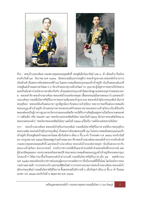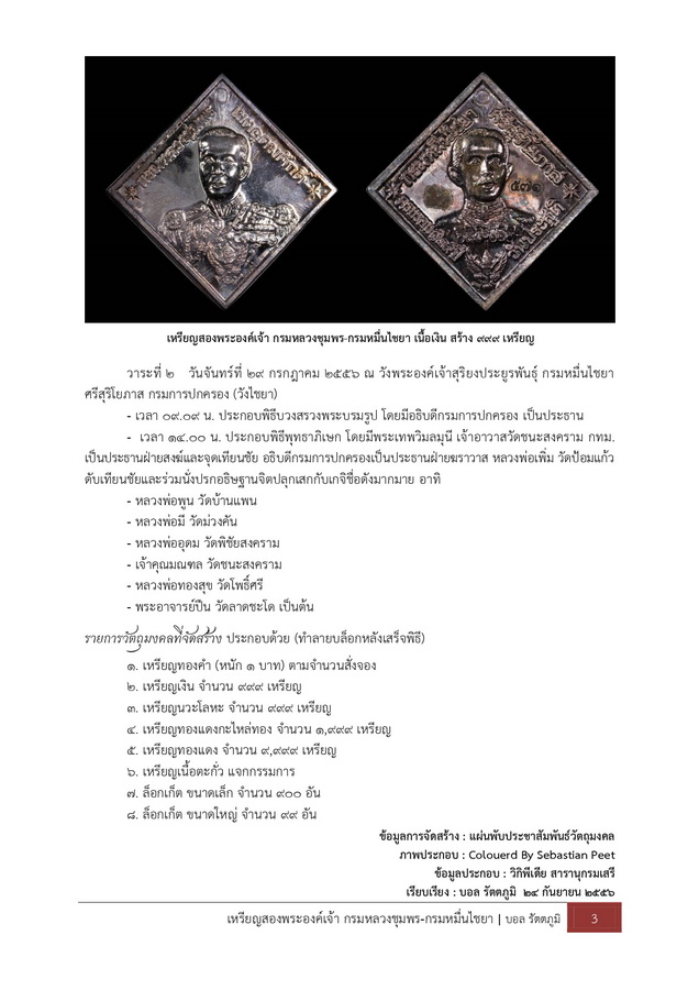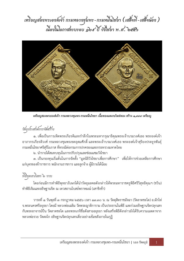 [ รายละเอียด ] เหรียญสองพระองค์เจ้า กรมหลวงชุมพร-กรมหมื่นไชยา เนื้อเงินหมายเลข ๕๗๑ บันทึกการจัดสร้างและเรียบเรียงข้อมูล เหรียญที่ระลึกรูปเหมือนสองพระองค์เจ้า (กรมหลวงชุมพร และกรมหมื่นไชยา) : บอล รัตตภูมิ ๒๔ ก.ย. ๕๖ เนื่องในโอกาสครบรอบ ๑๒๙ ปี วังไชยา มีวัตถุประสงค์เพื่อเป็นการเทิดพระเกียรติและรำลึกในพระมหากรุณาธิคุณพระเจ้าบรมวงศ์เธอ พระองค์เจ้าอาภากรเกียรติวงศ์ กรมหลวงชุมพรเขตอุดมศักดิ์ และพระเจ้าบรมวงศ์เธอ พระองค์เจ้าสุริยงประยูรพันธุ์ กรมหมื่นไชยาศรีสุริโยภาส ที่ทรงมีต่อกรมการปกครองและกระทรวงมหาดไทย และนำรายได้สมทบทุนในการปรับปรุงและซ่อมแซมวังไชยา และเป็นกองทุนเริ่มต้นในการจัดตั้ง “มูลนิธิวังไชยาเพื่อการศึกษา” เพื่อให้การช่วยเหลือการศึกษาแก่บุตรของข้าราชการ พนักงานราชการ และลูกจ้าง ผู้มีรายได้น้อย พิธีพุทธาภิเษก ๒ วาระ โดยก่อนมีการทำพิธีพุทธาภิเษกได้นำวัตถุมลคลดังกล่าวให้พระมหาราชครูพิธีศรีวิสุทธิคุณฯ (ชวิน) ทำพิธีเจิมและอธิษฐานจิต ณ เทวสถานโบสถ์พราหมณ์ (เสาชิงช้า) วาระที่ ๑ วันพุธที่ ๓ กรกฎาคม ๒๕๕๖ เวลา ๑๓.๓๐ น. ณ วัดดุสิตราชมัจฉา (วัดลาดชะโด) อ.ผักไห่ จ.พระนครศรีอยุธยา โดยมี หลวงพ่อเฉลิม วัดพระญาติการาม เป็นประธานในพิธี และร่วมอธิษฐานจิตปลุกเสกกับพระอาจารย์ปืน วัดลาดชะโด และพระเกจิชื่อดังสายอยุธยา หลังเสร็จพิธีดังกล่าวยังได้รับความเมตตาจากหลวงพ่อรวย วัดตะโก อธิษฐานจิตปลุกเสกเดี่ยวอย่างเข้มขลังภายในกุฏิ วาระที่ ๒ วันจันทร์ที่ ๒๙ กรกฎาคม ๒๕๕๖ ณ วังพระองค์เจ้าสุริยงประยูรพันธุ์ กรมหมื่นไชยาศรีสุริโยภาส กรมการปกครอง (วังไชยา) เวลา ๐๙.๐๙ น. ประกอบพิธีบวงสรวงพระบรมรูป โดยมีอธิบดีกรมการปกครอง เป็นประธาน เวลา ๑๔.๐๐ น. ประกอบพิธีพุทธาภิเษกโดยมี พระเทพวิมลมุนี เจ้าอาวาสวัดชนะสงคราม เป็นประธานฝ่ายสงฆ์และจุดเทียนชัย อธิบดีกรมการปกครองเป็นประธานฝ่ายฆราวาส หลวงพ่อเพิ่ม วัดป้อมแก้ว ดับเทียนชัยและร่วมนั่งปรกอธิษฐานจิตปลุกเสกกับเกจิชื่อดังมากมาย อาทิ หลวงพ่อพูน วัดบ้านแพน หลวงพ่อมี วัดม่วงคัน หลวงพ่ออุดม วัดพิชัยสงคราม เจ้าคุณมณฑล วัดชนะสงคราม หลวงพ่อทองสุข วัดโพธิ์ศรี พระอาจารย์ปืน วัดลาดชะโด เป็นต้น และมีการทำลายบล็อกหลังเสร็จพิธี รายการวัตถุมงคลที่จัดสร้าง ประกอบด้วย ๑. เหรียญทองคำ (หนัก ๑ บาท) ตามจำนวนที่สั่งจอง ๒. เหรียญเงิน จำนวน ๙๙๙ เหรียญ ๓. เหรียญนวะโลหะ จำนวน ๙๙๙ เหรียญ ๔. เหรียญทองแดงกะไหล่ทอง จำนวน ๑,๙๙๙ เหรียญ ๕. เหรียญทองแดง จำนวน ๙,๙๙๙ เหรียญ ๖. เหรียญตะกั่ว แจกกรรมการ ๗. ล็อกเก็ต