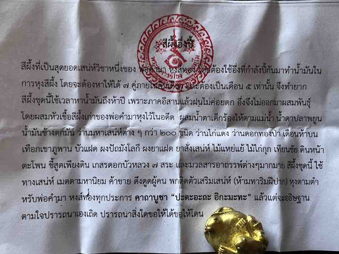 โดยผสมหัวเชื้อสีผึ้งเก่าของพ่อคำมาหุงไว้ในอดีต ผสมน้ำตาเด็กร้องไห้ตามแม่น้ำ น้ำตาปลาพยูน น้ำมันช้างตกมัน ว่านมหาเสน่ห์ต่าง ๆ กว่า ๒๐๐ ชนิด ว่านไก่แดง ว่านดอกทองป่า เดือนห้าบนเทือกเขาภูพาน บัวแฝด ผงปัถมังโลกี ผงยาแฝด ยาสั่งเสน่ห์ ไม้แหย่แย้ ไม้ไก่กุก เทียนชัย ดินหน้าตะโพน ชี้สูตเพียงดิน เกสรดอกบัวหลวง ๗ สระ และมวลสารอาถรรพ์ต่างๆมากมาย สีผึ้งชุดนี้ ใช้ทางเสน่ห์ เมตตามหานิยม ค้าขาย ดึงดูดผู้คน พกติดตัวเสริมเสน่ห์ (ห้ามทาริมฝีปาก) หุงตามตำ