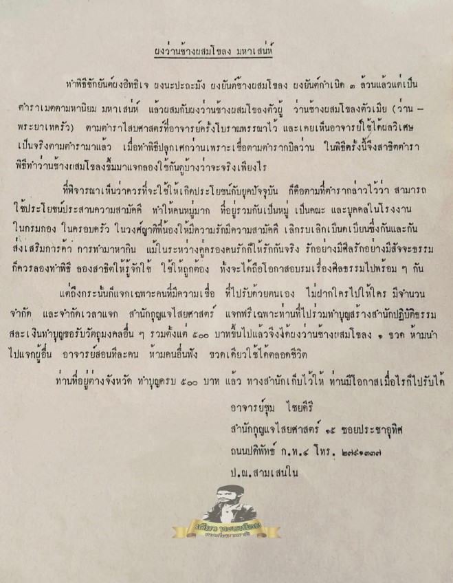 [ รายละเอียด ] ผงว่านช้างผสมโขลง มหาเสน่ห์ ทำการชักยันต์ผงอิทธิเจ ผงนะปัถมัง ผงยันต์ช้างผสมโขลง ผงยันต์กำเนิด 3 แล้วแต่เป็นตำราทางมหานิยม มหาเสน่ห์ แล้วผสมกับผงว่านช้างผสมโขลงตัวผู้และตัวเมีย ตามตำราไสยศาสตร์ที่อาจารย์ครั้งโบราณพรรณาไว้ และเคยเห็น. อาจารย์ใช้ได้ผลวิเศษเป็นจริงตามตำรามาแล้ว ทำพิธีปลุกเสกว่านตามตำรากบิลว่าน ในพิธีนี้จึงสาธิตตำราทำพิธีว่านช้างผสมโขลงขึ้นมาแจกให้ลองใช้กันดูบ้างว่าจริงเท็จเพียงไร ที่พิจารณาเห็นว่าควรจะใช้ให้เกิดประโยชน์กับปัจจุบัน ก็คือตามที่ตำรากล่าวไว้ว่า สามารถใช้ประโยชน์ประสานความสามัคคี ทำให้คนหมูมากที่อยู่รวมกันเป็นหมู่ เป็นคณะ และบุคคลในโรงงาน ในกรมกอง ในครอบครัว ในวงศ์ญาติพี่น้องมีความรักและสามัคคี เลิกรบเลิกเบียดเบียนซึ่งกันและกัน ส่งเสริมการค้าการทำมาหากิน แม้ในระหว่างคู่ครองคนรักก็ให้รักกันจริง รักอย่างมีศีลรักอย่างมีสัจธรรม ก็ควรลองทำพิธี ลองสาธิตให้รู้จักใช้ ใช้ให้ถูกต้อง ทั้งจะได้ถือโอกาสอบรมเรื่องศีลธรรมไปพร้อมๆกัน ขวดเดียวใช้ได้ตลอดชีวิต ผงช้างผสมโขลง อ.ชุม ไชยคีรี ผงช้างผสมโขลง กรณีศิษย์ใกล้ชิดจะทราบวิธีการใช้ผงช้างผสมโขลงตัวนี้ดี ถึงสรรพคุณของผงชนิดนี้ ด้านมหาเสน่ห์ ผงช้างผสมโขลง (มีแต่คนมารุมล้อมอยากเป็นคู่) อาจารย์ชุม ไชยคีรี หลอดเดิมๆหลอดของแท้แบบนี้หายาก เป็นเมตตามหาเสน่ห์แก่เพศตรงข้ามแบบเน้นๆ เน้นทางด้านเสน่ห์ เมตตา อย่างรุนแรง ชื่อของว่านได้บอกสรรพคุณอย่างชัดอยู่แล้ว วิธีใช้ ผู้ใดต้องการให้คนในบ้านหลงรักเราทั้งบ้าน ก็ให้เอาเนื้อผงว่านนี้หยอดลงไปในตุ่มน้ำกิน คนทั้งบ้านจะหลงรักเราสิ้นแล)" หากผู้ใดพกติดตัวไว้แม้เป็นหญิงก็จะเป็นที่รักหลงใหลของชายหนุ่ม หรือผู้ที่ได้พบเห็น หากเป็นชายก็จะเป็นที่รักใคร่ของหญิงสาว แต่จะอย่างไรก็ตามแม้จะมีข้อดีก็มีข้อที่ควรต้องระวังเป็นอย่างมาก และถือเป็นข้อห้ามของการใช้ช้างผสมโขลง นั่นก็คือ หากได้เสียแล้วต้องรับผิดชอบเลี้ยงดูห้ามทอดทิ้ง ห้ามผิดลูกผิดเมียผู้อื่นอย่างเด็ดขาด เพราะอาถรรพ์แรงมาก (ข้อแนะนำ การที่คิดจะใช้กับผู้หญิง หากจะใส่ผสมกับน้ำก็ดี ผสมกับอาหาร ให้ผู้หญิงกินก้ดี เมื่อได้เสียกันแล้ว ต้องรับผิดชอบเลี้ยงดูให้ตลอดชีวิต ทำแล้วต้องรับผิดชอบ ถ้าเอาแบบธรรมดา แค่พกติดตัวไว้ก็เป็นเมตตามหาเสน่ห์สูงสุดตามตำราโบราณมี่พรรณนาไว้ ทั้งนี้ทั้งนั้นแล้วหากจะใช้ของขลังต้องทำยังไง ทุกสิ่งทุกอย่างต้องมีพระคาถากำกับด้วยครับ ยาวมา ตำทำการประกอบการใช้ด้วยครั