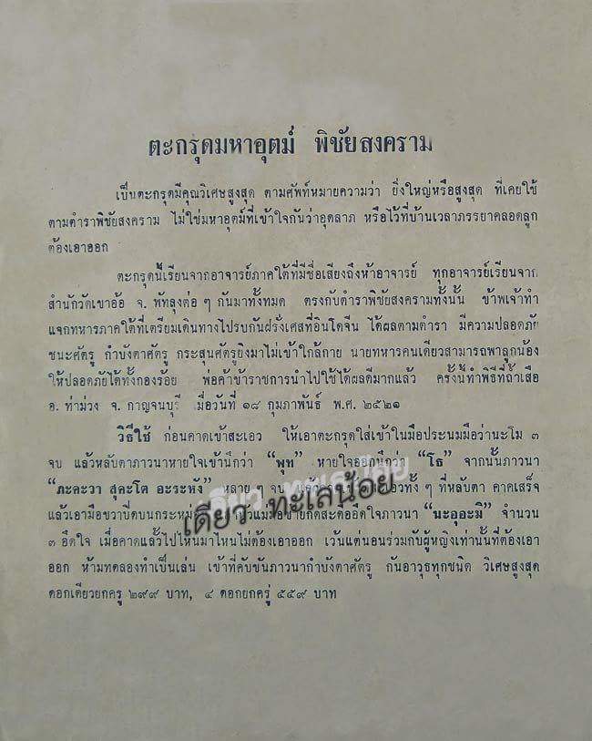 [ รายละเอียด ] ตะกรุดมหาอุตม์พิชัยสงคราม รุ่นเงียบเสียง อาจารย์ชุม ไชยคีรี ปี2521 ชนิด1ดอกและชนิด4ดอก ตะกรุดนี้บรรจุผงพุทธคุณกับสมุนไพรว่านยาอยู่ข้างในม้วนแล้วพันผ้าแดงและร้อยเชือกพร้อมใช้เป็น1ในวัตถุมงคล3อย่าง ไทย สู้ไม่หนีทิ้งแผ่นดิน รุ่นนี้#พิธีปลุกเสกที่ถ้ำเสือ อ.ท่าม่วง จ.กาญจนบุรี เมื่อ 18 ก.พ.2521 และเสกในพรรษาปี2524อีกครั้ง#ท่านว่าเหมาะแก่นักรบสมัยโบราณและนักรบปัจจุบัน พระอาจารย์ผู้มีความรู้ ทำพิธีตามฤกษ์ยามพิชัยยุทธเพื่อเป็นสิริมงคลแก่ผู้ใช้ที่ยึดมั่นในคุณพระและคุณอาจารย์ สูงสุดในด้านกำจัดภัยนานาชนิด กันอาวุธทุกชนิดของศัตรูไม่เข้าใกล้กาย เป็นตะกรุดที่มีคุณวิเศษสูงสุดหมายความว่ายิ่งใหญ่หรือสูงสุดที่เคยใช้ในตำราพิชัยสงคราม ไม่ใช่มหาอุตม์ที่เข้าใจกันว่าอุดลาภ หรือไว้ที่บ้านเวลาภรรยาคลอดลูกต้องเอาออก ตะกรุดมหาอุตม์พิชัยสงคราม นี้ท่านได้เรียนมาจากอาจารย์ภาคใต้ ที่มีชื่อเสียงถึงห้าอาจารย์ ทุกอาจารย์เรียนจากสำนักวัดเขาอ้อ พัทลุงต่อๆกันมาทั้งหมด **ก่อนคาดเข้าที่สะเอว ให้เอาตะกรุดใส่เข้าในมือประนมมือว่า นะโม 3 จบ แล้วหลับตาภาวนาหายใจเข้านึกว่า พุท หายใจออกนึกว่า โธ จากนั้นภาวนา ภะคะวาสุคะโต อะระหัง หลายๆจบแล้วคาดที่สะเอวทั้งๆที่หลับตา คาดเสร็จแล้วเอามือขวาปิดบนกระหม่อม เอาหัวแม่มือซ้ายกดสะดืออึดใจภาวนา นะอุอะมิ จำนวน 3 อึดใน เมื่อคาดแล้วไปไหนมาไหนไม่ต้องเอาออก เว้นแต่นอนร่วมกับผู้หญิงเท่านั้นที่ต้องเอาออก ห้ามทดลองทำเป็นเล่น เข้าที่คับขันภาวนา ภะคะวา สุคะโต อะระหัง กำบังตาศัตรู กันอาวุธทุกชนิด วิเศษสูงสุด ใช้ได้ทั้งผู้ชายและผู้หญิง ดอกเดียวกันได้เฉพาะตัวเอง 4 ดอกกันได้ถึงบริวารที่อยู่รอบๆตัวเรา ตะกรุดกันปลุกเสกในพิธี แจกไห้ข้าราชตำรวจ ทหารที่ไปรบได้ผลมาแล้ว ครั้งนี้ทำพิธีปลุกเสก3เดือนตลอด1ไตรมาส ถือเป็นครั้งที่ยิ่งใหญ่ เพราะตลอด1พรรษา ท่าน อ.ชุม ไม่พูดกับใครเลย เลยตั้งชื่อรุ่นนี้ว่า รุ่นเงียบเสียง ปิดวาจาในพิธีปลุกเศก ถือเป็นพิธีที่สุดยอดมากครับและได้นำมาเข้าพิธีอีกครั้งนึงในปี2524 ครั้งนี้เป็นพิธีสุดท้ายของ อ.ชุม ที่ได้ทำของดีไว้ไห้ ปลุกเสกทิ้งทวน ของวิเศษ 3อย่างไทย สู้ไม่หนีทิ้งแผ่นดิน(รุ่นเงียบเสียง)เป็นรุ่นสุดท้าย ที่ อ.ชุมได้ ตั้งใจเสกครับก่อนท่านจะสิ้นบุญ......ตะกรุดนี้มีสภาพเก่าเดิมๆหายากยากมากครับ ปัจจุบันของเลียนแบบเยอะมากครับ