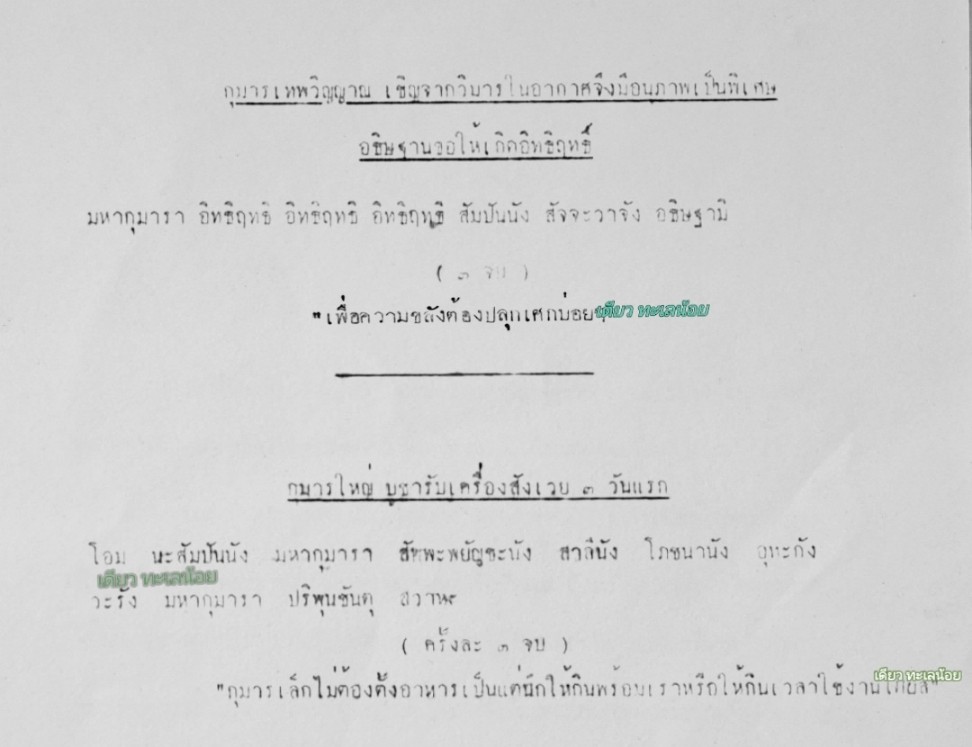 [ รายละเอียด ] กมารเทพวิญญาณ เชิญจากวิมารในอากาศจึงมีอนุภาพเป็นพิเศษ กุมารเทพวิณญานอ.ชุม ไชยคีรี เป็นเทพกุมารชั้นสูงไม่มีส่วนผสมของวัสดุอาถรรพ์ใดๆ แต่จะใช้ตะกรุดเทพดวงวิญญาณ ฝังเข้าไปที่ใต้ฐานของรูปกุมารเทพ เพื่ออัญเชิญเทพวิญญาณเข้าสถิตในตัวกุมารในแต่ละตน เป็นดวงวิญญานของเทพที่เป็นเด็กมีอายุไม่เกิน9ปีจากวิมารในอากาศที่ ที่อยุ่บรรดาของเทพที่มีอิทธิฤทธิ์มากเป็นมหากุมารเทพที่จะมีฤทธิ์และมีอนุภาพมากกว่าบรรดากุมารทั้งปวง กุมารขนาดบูชานี้ทำด้วยเนื้อเนซิ่นผสมผงเป็นรูปเด็กผมจุกยืนท้าวสะเอวทรงเครื่อง อ.ชุมได้สร้างตามตำราโบราณเป็นตำราของพระฤาษีผู้ทรงฤทธิ์ วิชานี้เป็นวิชาที่หาคนสำเร็จได้ยากมากๆเพราะต้องใช้จิตชั้นสูงถึงจะสื่อกับดวงจิตของเทพบนวิมาณได้ จะต้องอัญเชิญทีละตน ที่ลงตะกรุดเทพวิณญานไว้ที่ฐานฐานตัวไหนก็ตัวนั้นเป็นกุมารเทพใช้จิตแยกในแต่แต่ละตน เพราะฉนั้นกุมารเทพในลักษณะนี้จึงหาผู้สร้างได้ค่อนข้างยากมาก กุมารใหญ่ บูชารับเครื่องสังเวย ๓ วันแรก "กุมารเล็กไม่ต้องตั้งอาหารเป็นแต่นึกให้กินพร้อมเราหรือให้กินเวลาใช้งานได้ผล" อธิษฐานขอให้เกิดอิทธิฤทธิ์ มหากุมารา อิทธิฤทธิ อิทธิฤทธิ อิทธิฤทธิ สัมปันนัง สัจจะวาจัง อธิษฐามิ (3 จบ) บูชารับเครื่องสังเวย โอม นะสัมปันนัง มหากุมารา สัพพะพยัญชะนัง สาลีนัง โภชนานัง อุทะกัง วะรัง มหากุมารา ปริพุนชันตุ สวาหะ (3 จบ)"เพื่อความขลังต้องปลุกเศกบ่อยๆ" วิเศษนัก กุมารเทพอ.ชุม ไชยคีรี เนื้อเรซิ่นมีหลายสีครับ ปัจจุบันมีของเลียนแบบต้องดูและศึกษาให้ดีๆครับของที่ทันยุคอ.ชุมนั้นหาได้ยากปัจุบัน องค์นี้ทรงเครื่องชุดสีฟ้าสภาพเก่าหิ้งๆเดิมๆ