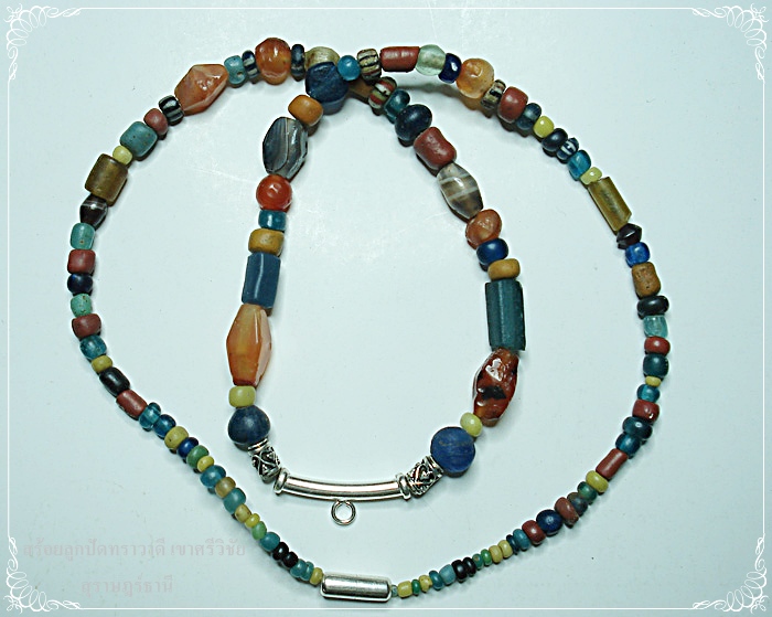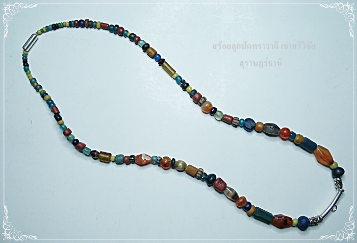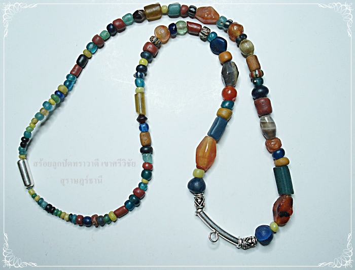 สลับเม็ดคั่นของลูกปัดชนิดต่างๆอย่างลงตัวเรียกได้ว่าสร้อยเส้นนี้เรียงร้อยความเหมาะสมและคุณค่าของลูกปัดต่างๆมาไว้ด้วยกันโดยอาศัยกาลเวลาสะสมเพื่อให้ได้มาซึ่งคู่ผสมในขนาดใกล้เคียงกันใช้เวลาแรมปีครับเพราะเป็นที่ทราบแน่ลูกปัดที่ขึ้นกรุเองนั้นไม่มีลูกปัดที่ไหนจะเจอในกรุได้เป็นคู่ดังนั้นการผสมคู่ลูกปัดจึงทำได้แค่หาชนิดและขนาดที่ใกล้เคียงกันที่สุดทั้งนี้ก็ต้องอาศัยวันเวลาในการสะสมเพื่อให้เกิดความเป็นโบราณดังเช่นอดีตด้วยอารยที่ตกทอดมาในสมัยศรีวิชัย เพาะลูกปัดเหล่านี้หาใช้เป็นเครื่องประดับที่บ่งบอกถึงสถานะทางสังคมอย่างเดียวไม่แต่ลูกปัดทราวาดีนั้นเป็นสิ่งที่ซ่อนเร้นไปด้วยอำนาจที่ส่งเสริมคนที่บูชาอย่างมาก((ข้อนี้นั้นผู้ที่บูชาสัมผัสจักษ์รู้ได้เองเพราะเป็นปัจจัตตังครับ))หากใครมองหาเครื่องประดับที่เป็นหนึ่งชนิดที่เรียกว่าหากต้องการแล้วมิสามารถหาเองจากแหล่งด้วยการค้นหาเองจากกรุได้เพียงในวันเดียวแน่ ลองดูครับลูกปัดอาณาศรีวิชัยนี้ซ่อนร่องรอยแห่งอดีตไว้ให้เราเรียนรู้จริงๆครับ..