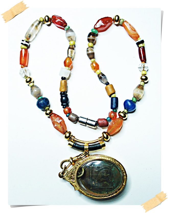 สร้อยลูหปัดศรีวิชัย ประดับด้วยลูกทองคั่น และคัดลูกปัดที่ลักษณะใกล้เคียงกันและขนาดขนาดที่ต่างกันไม่มากนำมาเรียงสร้อยเพื่อเป็นเครื่องประดับลงตัวระหว่างยุคสมัยเก่าและใหม่เพื่อความแตกต่างแห่งการเวลาที่ประสมประสานลงตัว*