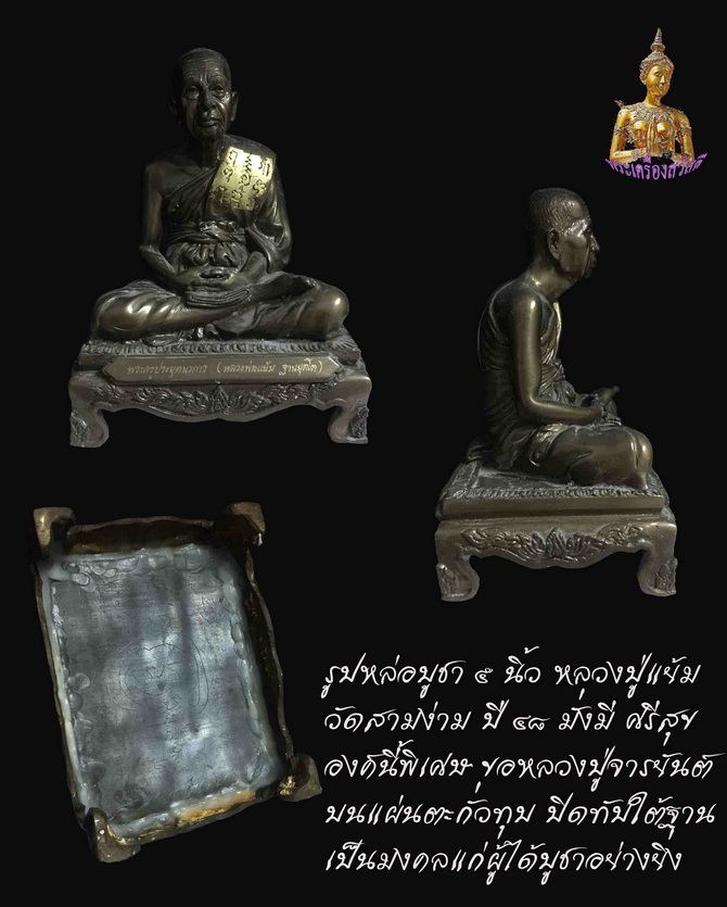 [ รายละเอียด ] รูปหล่อบูชา หลวงปู่แย้ม วัดสามง่าม รุ่น ๒ มั่งมี ศรีสุข หน้าตัก ๕ นิ้ว สร้างปี ๒๕๔๘ ตอกโค็ต/ หมายเลข องค์นี้ ๑๗๖ จำนวนจัดสร้าง ๓๐๐ องค์ หายากครับท่าน (ได้นำแผ่นตะกั่วทุบหนามาก ไปกราบขอหลวงปู่จารยันต์ให้ในสมัยนั้น จึงนำมาปิดทับไว้ใต้ฐานอีกชั้น เป็นมงคลแก่ผู้ได้บูชาเป็นอย่างยิ่ง)