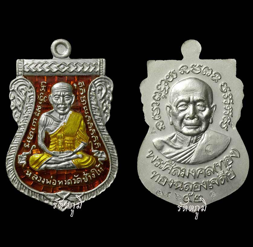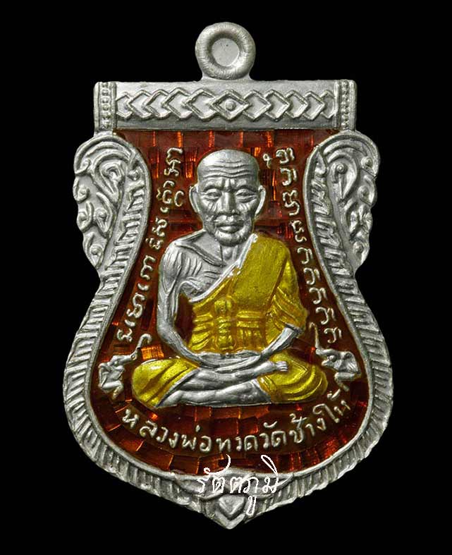 [ ชื่อพระ ] เหรียญเสมาหน้าเลื่อน อ.ทอง เนื้อเงินลงยาสีแดง รุ่นทองฉลองเจดีย์