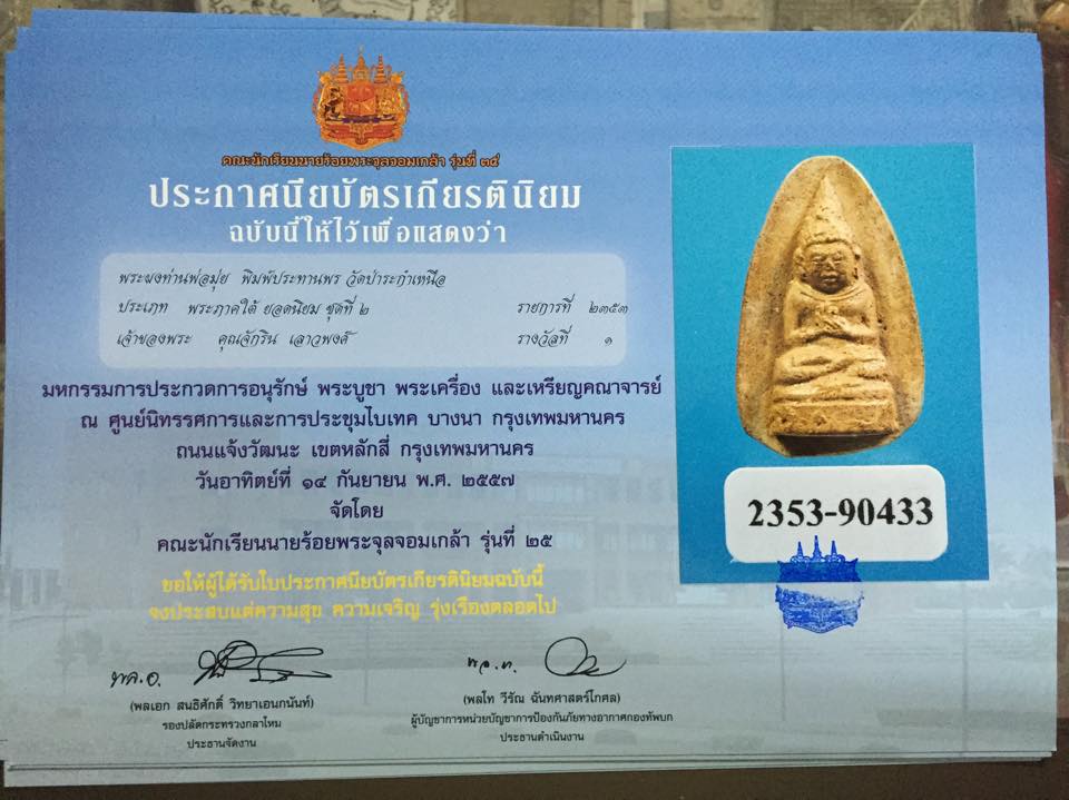[ รายละเอียด ] (ราลวัลที่ ๑ งานไบเทค บางนาจัดโดยคณะนักเรียนนายร้อย จปร,รุ่น ๒๕ วันที่ ๑๔ กย. ๒๕๕๗) พระกลีบบัว ประทานพร รุ่นแรก หลวงพ่อมุ่ย วัดป่าระกำเหนือ เนื้อผงปถมัง ที่มีส่วนผสมเนื้อผงน้ำนมควายอันเลื่องลือ ที่จัดสร้างพร้อมพระปิดตารุ่นแรกของท่านในราวปี ๒๕๑๓ -๒๕๑๕ มีพุทธคุณ เด่นชัด ด้านค้าขาย เมตตามหานิยม เป็นยอด รวมถึงด้านแคล้วคลาดปลอดภัย มีประสบการณ์มาแล้วเป็นที่ประจักษ์