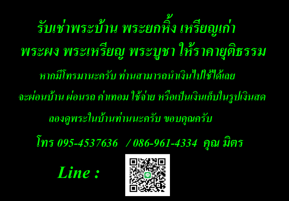 | เงื่อนไขการรับประกัน | รับประกันพระแท้ 15 วันหลังรับพระ รับประกันความพึงพอใจ 2 วันหลังรับพระหรือตามข้อตกลงผู้ให้เช่ากับผู้เช่าทั้งสองฝ่าย เข้าใจตรงกัน |