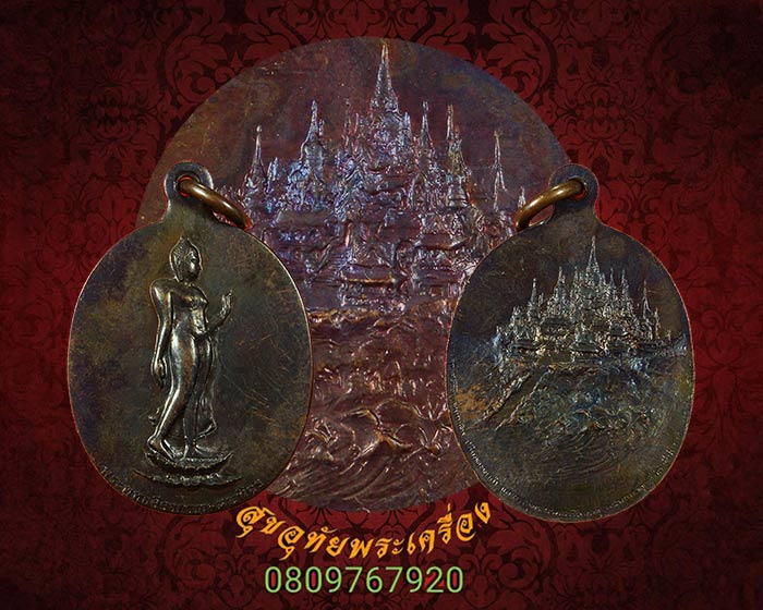 630.เหรียญพระพุทธลีลากาญจนบพิตรทีระลึกในหลวงเสด็จทรงยกฉัตรปลียอดทองคำ พระมหาเจดีย์ภักดีประกาศ ปี23*2