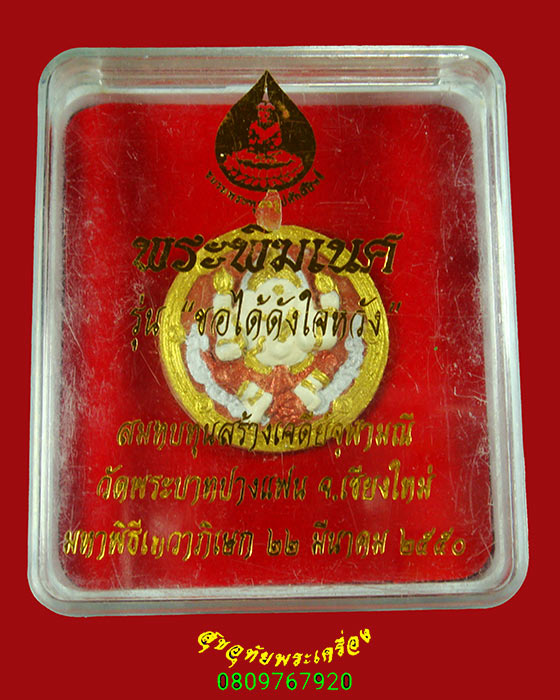 [ ชื่อพระ ] 950.พระพิฆเนศ วัดพระบาทปางแฟน จ.เชียงใหม่ ปี 2550 รุ่นขอได้ดั่งใจหวัง เนื้อผงลงสีปิดทอง กล่องเดิม**1