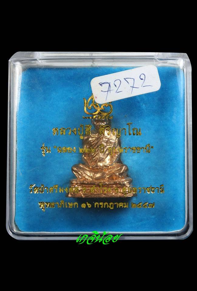 [ รายละเอียด ] รูปหล่อหลวงปู่สี สิริญาโณ วัด ป่าศรีมงคล จ.อุบลราชธานี รุ่น ฉลองครบ ๒๒๒ ปี จังหวัดอุบลราชธานี ปี ๒๕๕๗ เนื้อโลหะผสม ตอกโค็ตและ หมายเลขชัดเจน ๗๒๗๒ (หน้า ๙ หลัง ๙ หรือ ๗+๒+๗+๒=๑๘ และ ๑+๘=๙ หมายถึงความก้าวหน้าและมุ่งหน้าต่อไปอย่างไม่สิ้นสุด เป็นเลขแห่งความเจริญก้าวหน้าที่มีมูลค่ามากทีเดียว ) ใต้ฐานอุดมวลสาร พร้อมกล่องเดิม พิธีพุทธาพิเษก ๑๖ กรกฏาคม ๒๕๕๗ ดำเนินการจัดสร้างโดย องค์การบริหารส่วนจังหวัด อุบลราชธานี เพื่อฉลองครบรอบ ๒๒๒ ปี จังหวัดอุบลราชธานี งานพิธีทำบุญตักบาตรพระสงฆ์ ๒๒๒ รูป ในงานเฉลิมฉลอง ๒๒๒ ปี อุบลราชธานี เมื่อวันพุธที่ ๑๖ กรกฎาคม ๒๕๕๗ เวลา ๐.๐๕-๑๕.๕๙ น. ที่วัดหลวง วิหารพระเจ้าใหญ่องค์หลวง และลานคอนกรีตและท่าน้ำวัดหลวงริมแม่น้ำมูล ถนนพรหมเทพ ข้างตลาดใหญ่ ตำบลในเมือง อำเภอเมือง จังหวัดอุบลราชธานี พสกนิกรชาวจังหวัดอุบลราชธานีทุกหมู่เหล่า นำโดย เสริม ไชยณรงค์ ผู้ว่าราชการ จังหวัดอุบลราชธานี เป็นประธานฆราวาส, พระราชธรรมโกศล เจ้าอาวาสวัดพระเจ้าใหญ่องค์ตื้อ เจ้าคณะจังหวัดอุบลราชธานี ธรรมยุต เป็นประธานสงฆ์, พระครูวิลาสกิจจาทร เจ้าอาวาสวัดหลวง พร้อมคณะพระภิกษุ สามเณร ๒๒๒ รูป เป็นวันมหามงคลสมัยแห่งการสถาปนาเมืองอุบลราชธานี เวียนมาบรรจบครบ ๒๒๒ ปี ในวันพุธที่ ๑๖ กรกฎาคม ๒๕๕๗ และพิธีมหาพุทธาภิเษก รูปหล่อเหมือนบูรพาจารย์ และพระกริ่งจอมอุบลฯ เพื่อเป็นการรำลึกถึงคุณงามความดี ประชาสัมพันธ์ เผยแพร่ เชิดชูเกียรติบรรพบุรุษ เกียรติประวัติและภูมิปัญญา ที่บ่งบอกถึงความเป็นปราชญ์ของบรรพบุรุษชาวจังหวัดอุบลราชธานี จัดเป็นพระดี พิธีประวัติศาสตร์ สุดยอดพิธีใหญ่ของทางจังหวัดและของหลวงปู่ ฉลอง ๒๒๒ ปี จ.อุบลราชธานี และเป็นพระที่สมบูรณ์ด้วยหกดี (๑.มวลสารดี ๒.เกจิดี ๓.ฤกษ์ยามดี ๔.พิธีดี ๕.เจตนาในการสร้างดี ๖.ผู้มีไว้ครอบครองดี) น่าเก็บ น่าใช้อีกละคราฟ ***หลวงปู่สี สิริญาโณ วัดป่าศรีมงคล (วัดป่าบ้านเปือย) อ.สำโรง จ.อุบลราชธานี ท่านเป็นลูกศิษย์รุ่นแรกของพระโพธิญาณเถร (ชา สุภทฺโท) วัดหนองป่าพง ก่อนที่ท่านจะได้เข้ามาขอฝากตัวเป็นศิษย์เพื่อศึกษาพระธรรมกับหลวงพ่อชานั้น หลวงปู่สีท่านได้เคยร่ำเรียนวิชาการวิทยาคมต่างๆมาแล้วหลายสายหลายด้าน แม้แต่การใช้พระคาถาปัดเป่ารักษาคนป่วยไข้ให้หายจากอาการป่วยท่านก็ได้ร่ำเรียนมาจนแตกฉาน กะทั่งท่านได้มีโอกาสมาเจอกับหลวงพ่อชา ในปี พ.ศ. ๒๕๑๒ ท่านถึงได้ตัดสินใจเป็นมั่นคงหนักแน่นที่จะละทิ้งในวิชาอาคมต่างๆที่เรียนมา ทั้งหมดเพื่อที่จะนำตัวของท่านเข้าสู้การปฏิบัติธรร