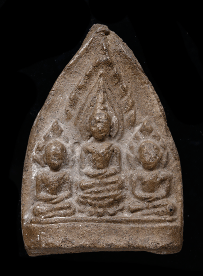 [ รายละเอียด ] พระสามหลวงพ่อแดง วัดทุ่งคอก สุพรรณบุรี ก่อนปี 2500 หลวงพ่อแดงท่านเป็นสหธรรมมิกกับหลวงพ่อเต๋ คงทอง ว่ากันว่าตอนท่านไปหาไม้ในป่าเพื่อมาซ่อมแซมวัด ท่านมักจะเดินทางไปสมทบกับหลวงพ่อแดงเป็นคณะเดียวกัน หลวงพ่อเต๋จะเรียก หลวงพ่อแดงไม้ใหญ่ เพราะท่านหาไม้เก่ง เดินป่าเก่ง วัตถุมงคลที่หลวงพ่อแดง วัดทุ่งคอกท่านสร้างไว้มีหลายอย่าง สร้างในช่วงก่อนและหลัง 2500 หลายพิมพ์ด้วยกัน โดยเฉพาะพระเนื้อดินของหลวงพ่อแดงและหลวงพ่อเต๋ บางรุ่นทั้งพิมพ์และส่วนผสมจะคล้ายกัน สำหรับองค์นี้เป็นพิมพ์พระพุทธเจ้าพร้อมด้วยพระอัครสาวก หรือเรียกกันว่า พระสาม มีขนาด 2.9 X 3.7 c.m. เนื้อออกดำเทา พิเศษตรงที่มีเขียนยันต์ด้านหลังด้วยครับ สภาพจริงสวย สมบูรณ์ไม่ใหญ่กำลังสวยครับ สร้างก่อน ปี 2500 ครับ แท้รับประกันครับ ส่วนพุทธคุณไม่ต้องพูดถึงสำหรับหลวงพ่อแดง วัดทุ่งคอก
